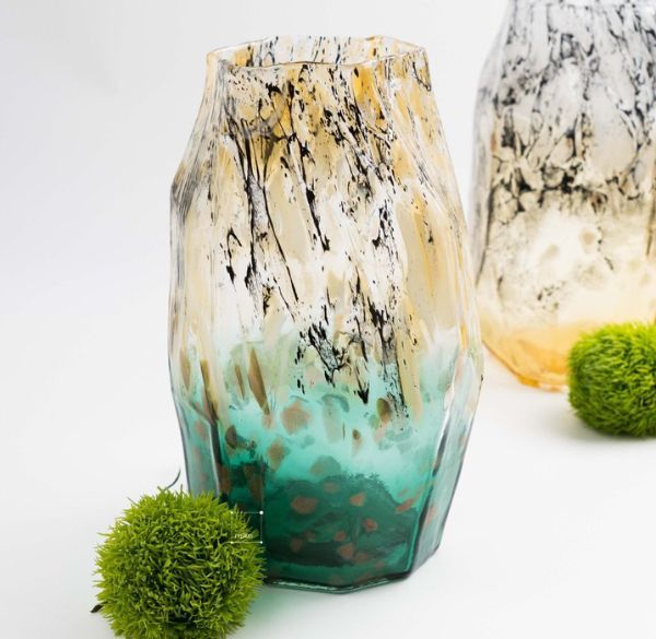 Bình hoa thủy tinh phối nhũ màu - nghệ thuật pha trộn giữa thủy tinh và ánh kim. Mẫu bình hoa thủy tinh phối nhũ màu sang trọng tại Passion được chế tác từ thủy tinh nung màu cao cấp. Phần thân bình không đối xứng mang cảm giác phóng khoáng, kết hợp hiệu ứng nhũ ánh kim lấp lánh tạo nên vẻ đẹp quyến rũ. Như Passion giới thiệu, “Với thiết kế tinh xảo, màu sắc bắt mắt và chất liệu cao cấp, sản phẩm này không chỉ là một bình hoa thông thường mà còn là một tác phẩm nghệ thuật độc đáo” . Bình có hai phiên bản màu: xanh lá và vàng hổ phách. Màu xanh lá mát mắt mang lại cảm giác tươi mới, trong khi vàng hổ phách ấm áp, quý phái. Sự kết hợp song hành của hai tông màu này tạo nên nét sang trọng và hài hòa độc đáo cho mỗi sản phẩm.