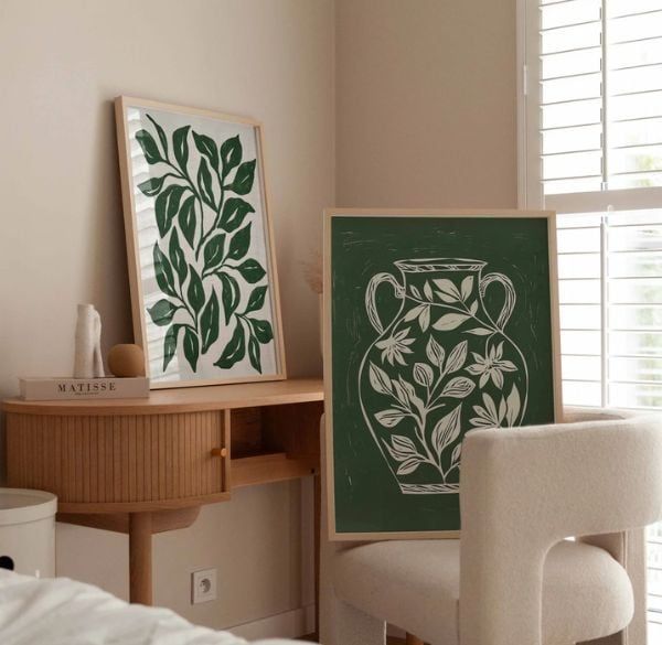 Tác phẩm lấy cảm hứng từ thiên nhiên, với hình ảnh chiếc bình gốm cổ điển chứa đầy những cành lá xanh mướt, mang lại cảm giác tươi mát và cân bằng cho không gian. Màu xanh lục chủ đạo kết hợp cùng nền be tạo nên một tổng thể hài hòa, rất dễ phối trong nhiều phong cách nội thất khác nhau - từ Scandinavian, Japandi đến hiện đại tối giản.