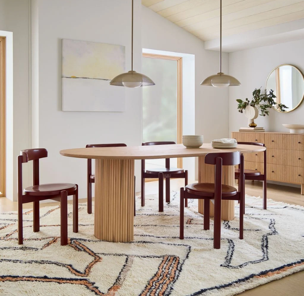 - Bàn ăn hình bầu dục: Bàn ăn hình bầu dục là sự kết hợp hoàn hảo giữa bàn ăn tròn và bàn ăn chữ nhật, mang đến sự mềm mại và thanh lịch cho không gian phòng ăn. Thiết kế này không chỉ giúp làm mềm các góc cạnh mà còn tạo sự linh động trong việc bài trí, đặc biệt là cho các không gian dài và hẹp. Mẫu bàn này mang lại vẻ đẹp hài hòa, giúp không gian thêm phần sang trọng mà không kém phần thoải mái. Bàn ăn hình bầu dục phù hợp với các không gian có diện tích vừa và lớn, nơi có thể bày trí thêm nhiều món ăn mà không làm phòng ăn trở nên chật chội.