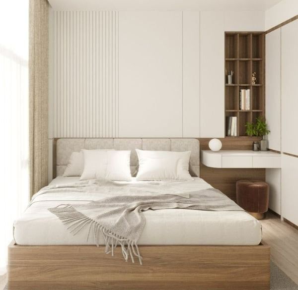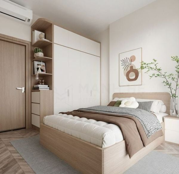 - Gợi ý từ Passion: Kết hợp tủ đầu giường gỗ tone sáng cùng tường màu trắng hoặc be nhạt sẽ tạo cảm giác rộng hơn cho phòng ngủ 10m2, đồng thời giữ được sự ấm áp và tự nhiên.