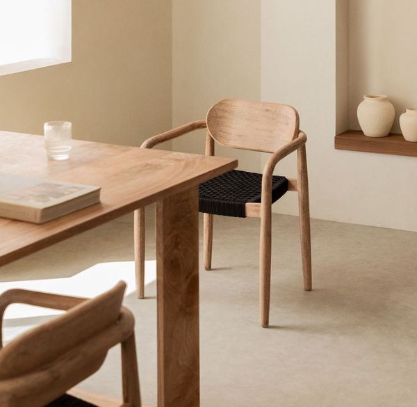 - Bàn ghế ăn gỗ nên đi cùng ghế gỗ hoặc ghế bọc vải/da có chân gỗ để tạo liên kết.