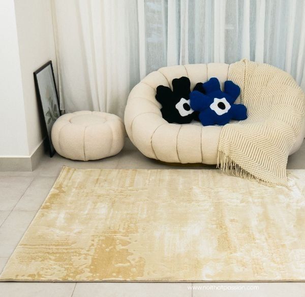 - Ghế đôn màu trung tính → chọn thảm có họa tiết nhẹ để tạo chiều sâu.