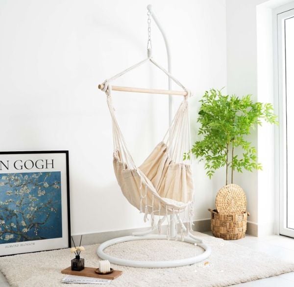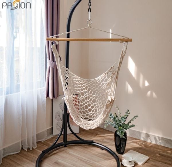 - Đối với ghế võng thư giãn hoặc võng xích đu, có thể linh hoạt theo thiết kế đi kèm chân đỡ hoặc chân xoay.