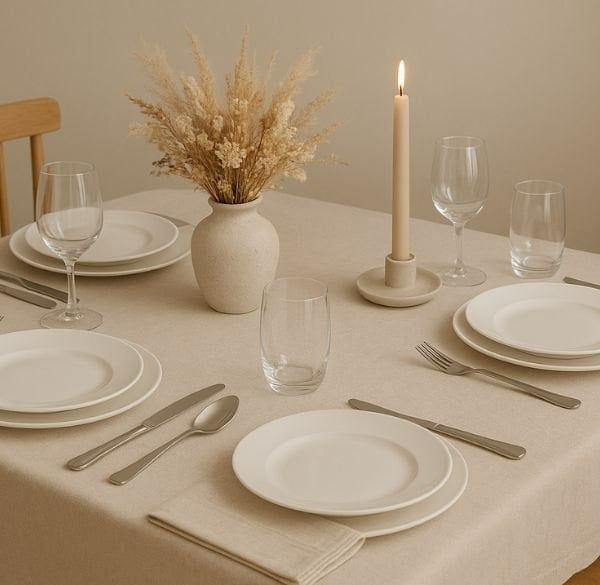 Một chiếc khăn trang trí bàn ăn chất liệu linen, cotton hoặc ren nhẹ với tông màu trung tính sẽ giúp tạo nền tinh tế, vừa bảo vệ mặt bàn vừa mang lại cảm giác ấm áp.