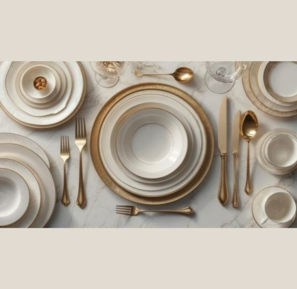 Chất liệu sứ trắng hoặc sứ ivory với đường viền mảnh ánh vàng/bạc giúp bàn ăn trông trang nhã và đồng bộ.