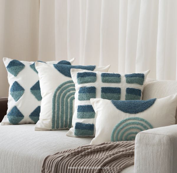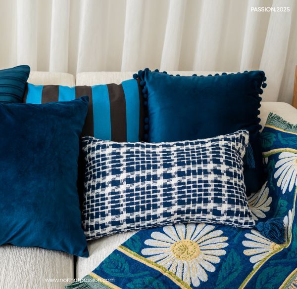 - Gợi ý phối: Nếu bạn dùng gối vuông tựa lưng tông xanh – trắng, hãy kết hợp cùng thảm và rèm cửa màu trung tính để tạo cảm giác mát mẻ.