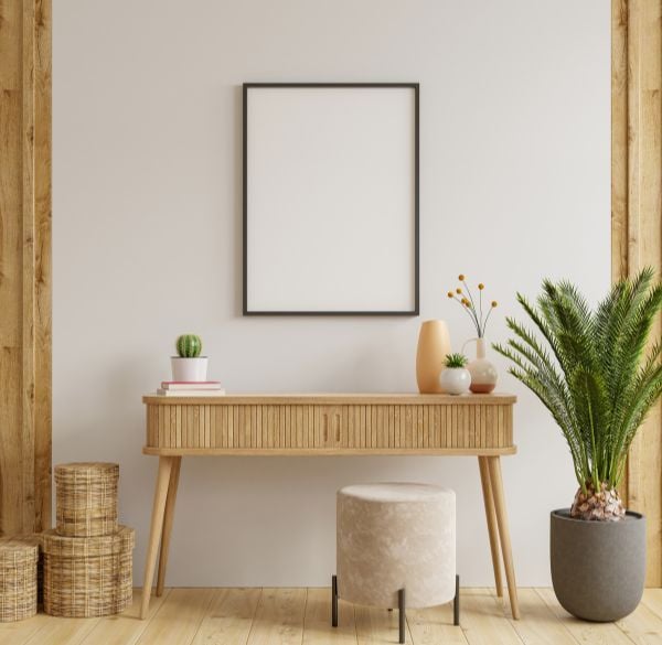 - Nhà phố - không gian vừa: Đối với nhà phố, bạn có thể linh hoạt hơn trong lựa chọn kích thước bàn console. Những mẫu bàn console trang trí dài hơn, tầm 120-150cm, và chiều sâu khoảng 35-40cm sẽ phù hợp để kê dọc hành lang hoặc sau ghế sofa phòng khách. Bên cạnh đó, bạn có thể chọn loại có ngăn kéo để tăng thêm tiện ích lưu trữ.