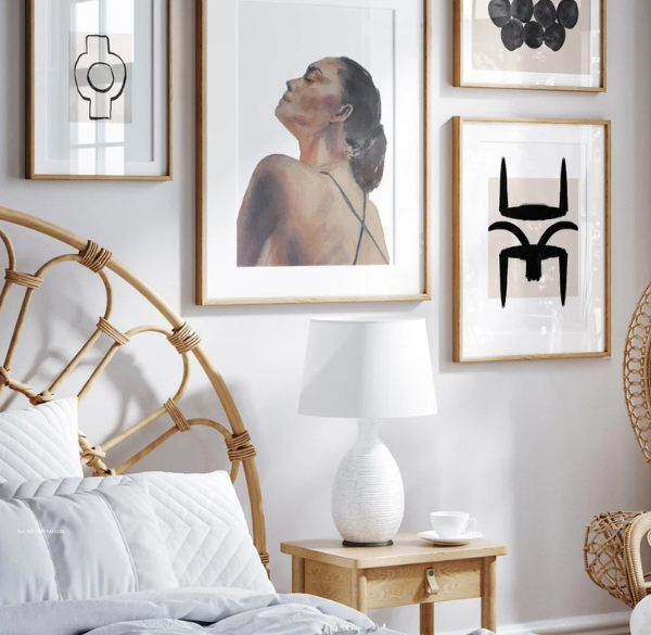 - Phối hợp nhiều tranh: Nếu ghép nhiều bức nhỏ, giữ khoảng cách đồng đều (5–10 cm) giữa các khung. Đảm bảo tổng thể không bị lộn xộn, tuân theo tỉ lệ “vàng” (Golden Ratio) để tăng tính thẩm mỹ.