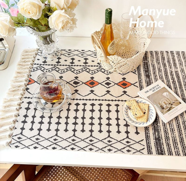 - Các mẫu khăn trải bàn hình chữ nhật chất liệu canvas thường được in họa tiết đơn sắc, hình học hoặc chữ viết tạo cảm giác hiện đại.