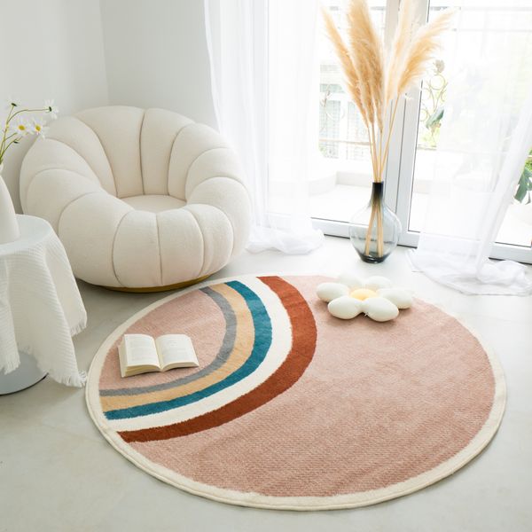 Ngoài những mẫu thảm dài, bạn có thể lựa chọn cho mình một mẫu thảm tròn xinh xắn, dịu dàng, tạo không gian thư giãn ấm áp dành riêng cho mình. Mẫu thảm tròn lông ngắn hoạ tiết viền cầu vồng sáng tạo, màu sắc dịu dàng cùng chất lông mềm mại sẽ giúp bạn có những giây phút thư giãn tuyệt vời ngay tại phòng ngủ.