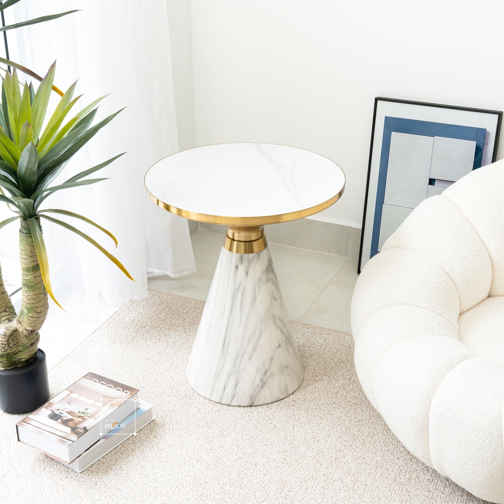 Mặt bàn được làm từ đá thạch màu trắng ngà với các đường vân tự nhiên mềm mại – không chỉ đẹp mà còn dễ vệ sinh, chống bám bẩn tốt. Đường kính mặt bàn 50cm vừa đủ để đặt ly nước, sách, lọ hoa hay một vài vật trang trí nhỏ xinh. Chiều cao tiêu chuẩn 59cm giúp bàn phù hợp với nhiều kiểu ghế sofa, ghế thư giãn hoặc bố trí cạnh giường ngủ.