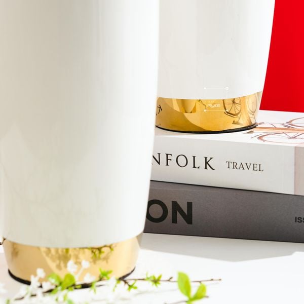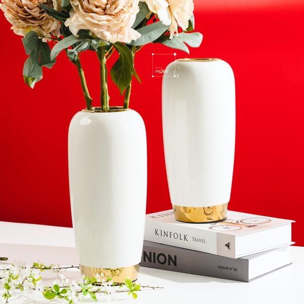 Được làm từ chất liệu gốm sứ phủ bóng, kết hợp với chân bình mạ điện đẳng cấp, tạo nên nét chấm phá cho nhà ở của gia chủ. Bình mang màu sắc trắng sứ thanh lịch, thích hợp decor trong nhiều khu vực khác nhau như: kệ trang trí, bàn tiếp khách, bàn làm việc,... Tuy nhiên, bạn cũng có thể decor cùng những cành hoa cao, để nâng tầm thẩm mỹ cho không gian.