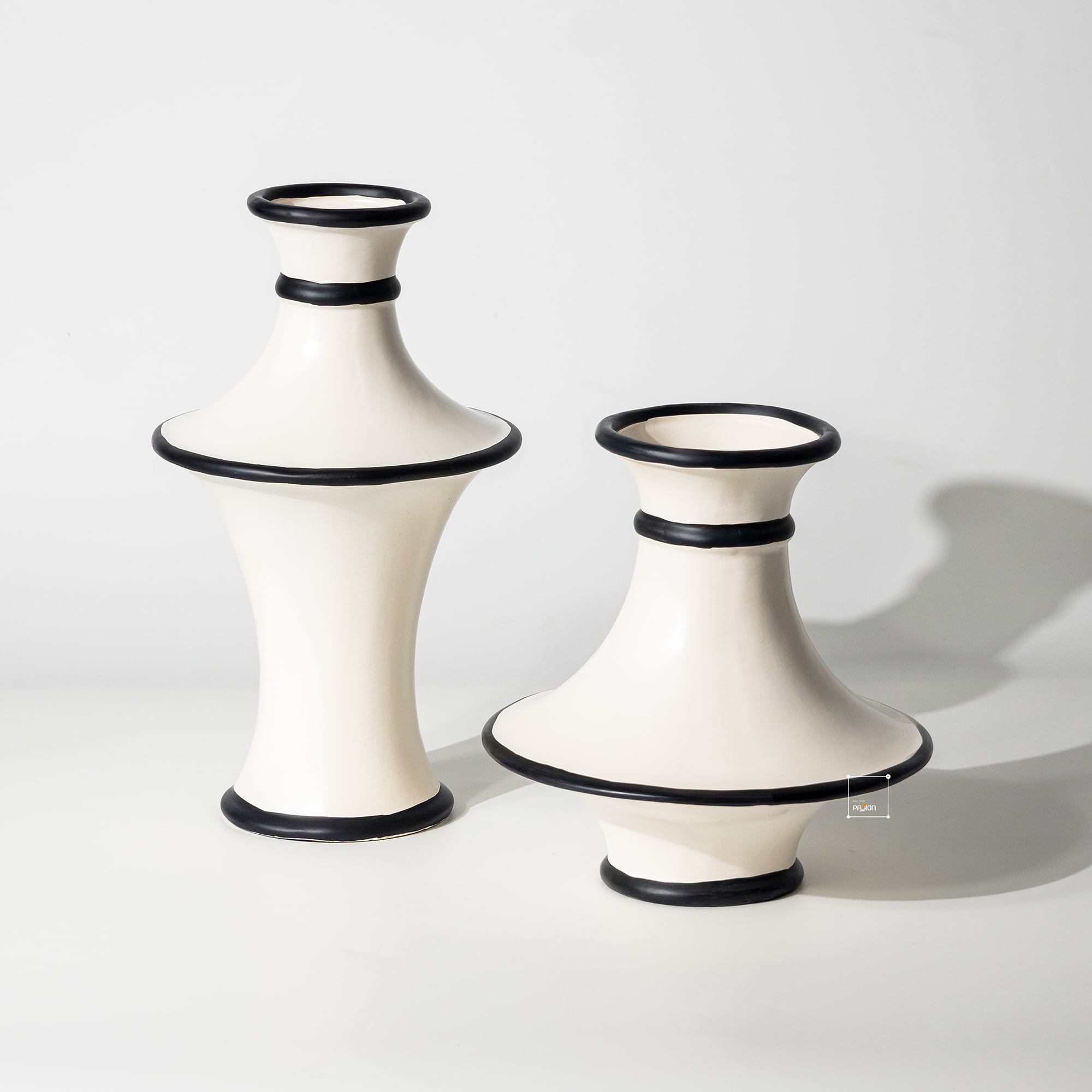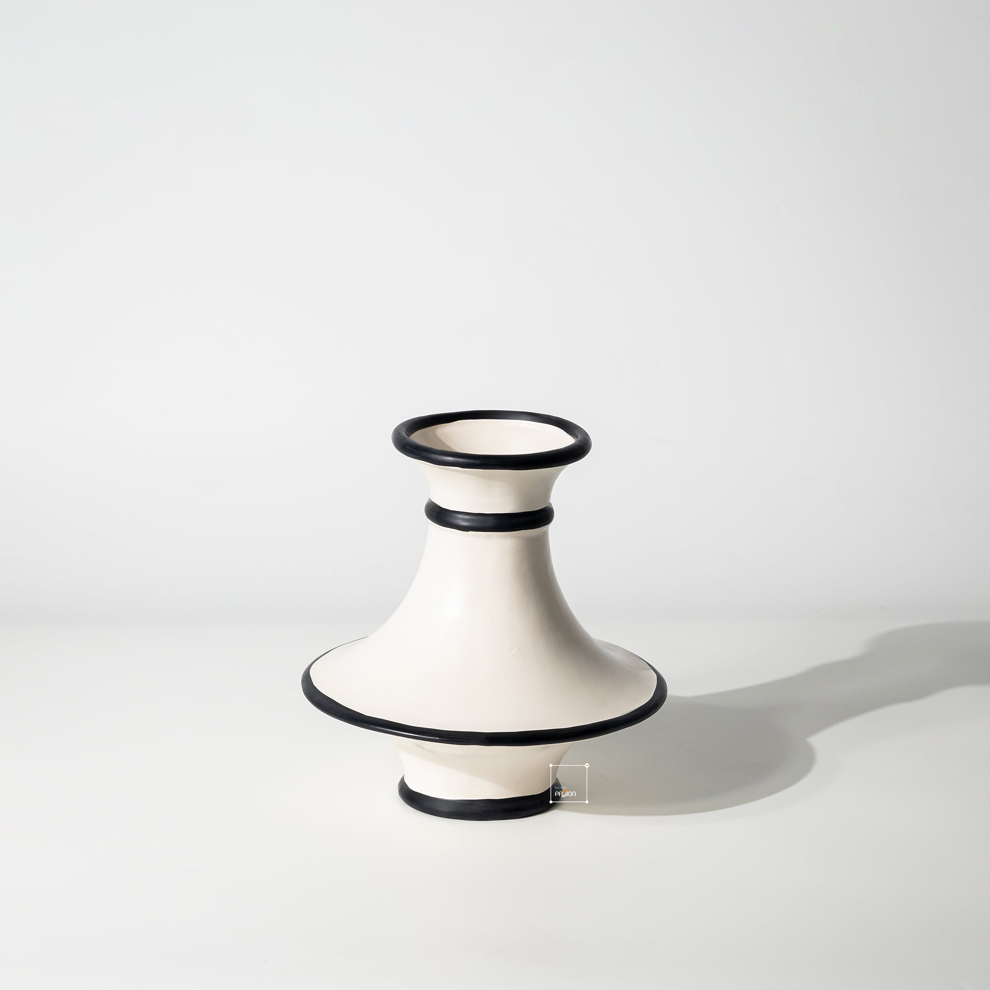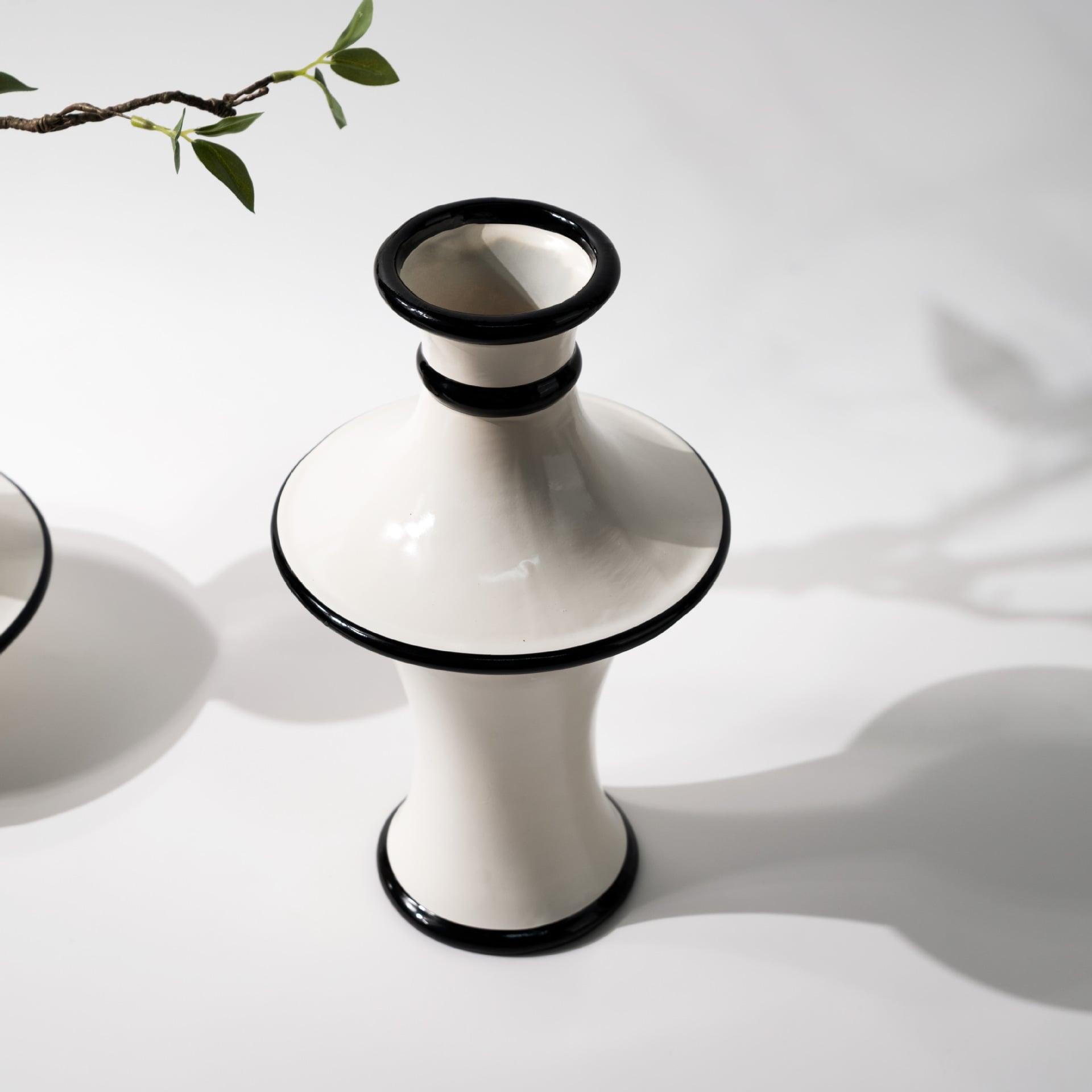 Lấy cảm hứng từ phong cách kiến trúc và nghệ thuật Pháp, bình hoa gốm kiểu Pháp phối vòng đen là sự kết hợp hài hòa giữa đường cong mềm mại và gam màu tương phản tinh tế. Màu trắng sứ được phủ bóng mịn màng, điểm nhấn là những đường viền đen mảnh chạy quanh miệng và thân bình, tạo nên sự cân bằng hoàn hảo giữa cổ điển và hiện đại.