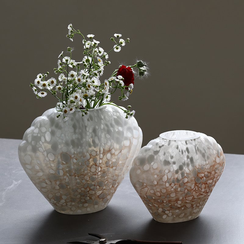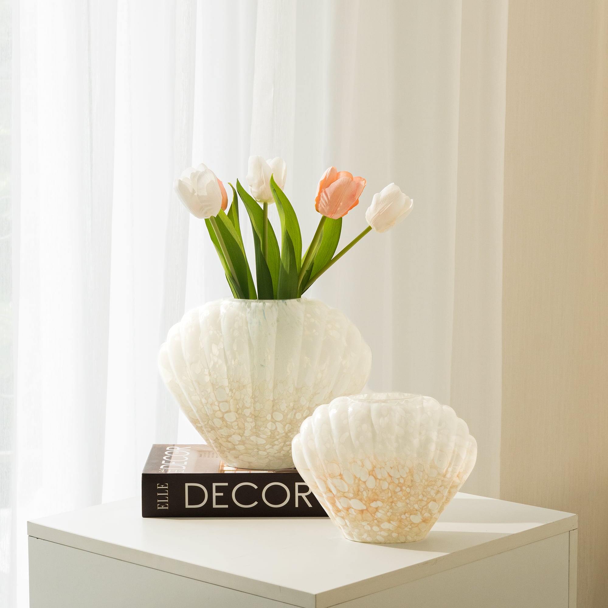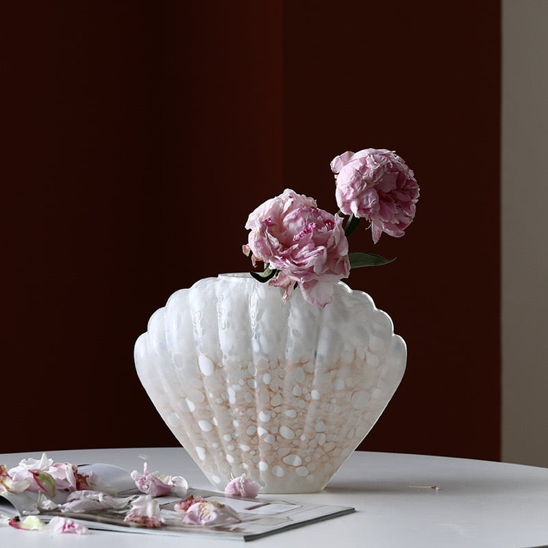 - Phối cùng ánh sáng và nền trung tính: Đặt bình hoa thủy tinh vỏ sò ở nơi có ánh sáng tự nhiên hoặc gần đèn vàng sẽ làm nổi bật hiệu ứng nhũ lấp lánh rất đặc trưng của sản phẩm. Bạn có thể đặt lên bàn gỗ, mặt đá marble trắng hoặc thảm lông để tăng độ tương phản và làm nổi bật hình khối của bình.