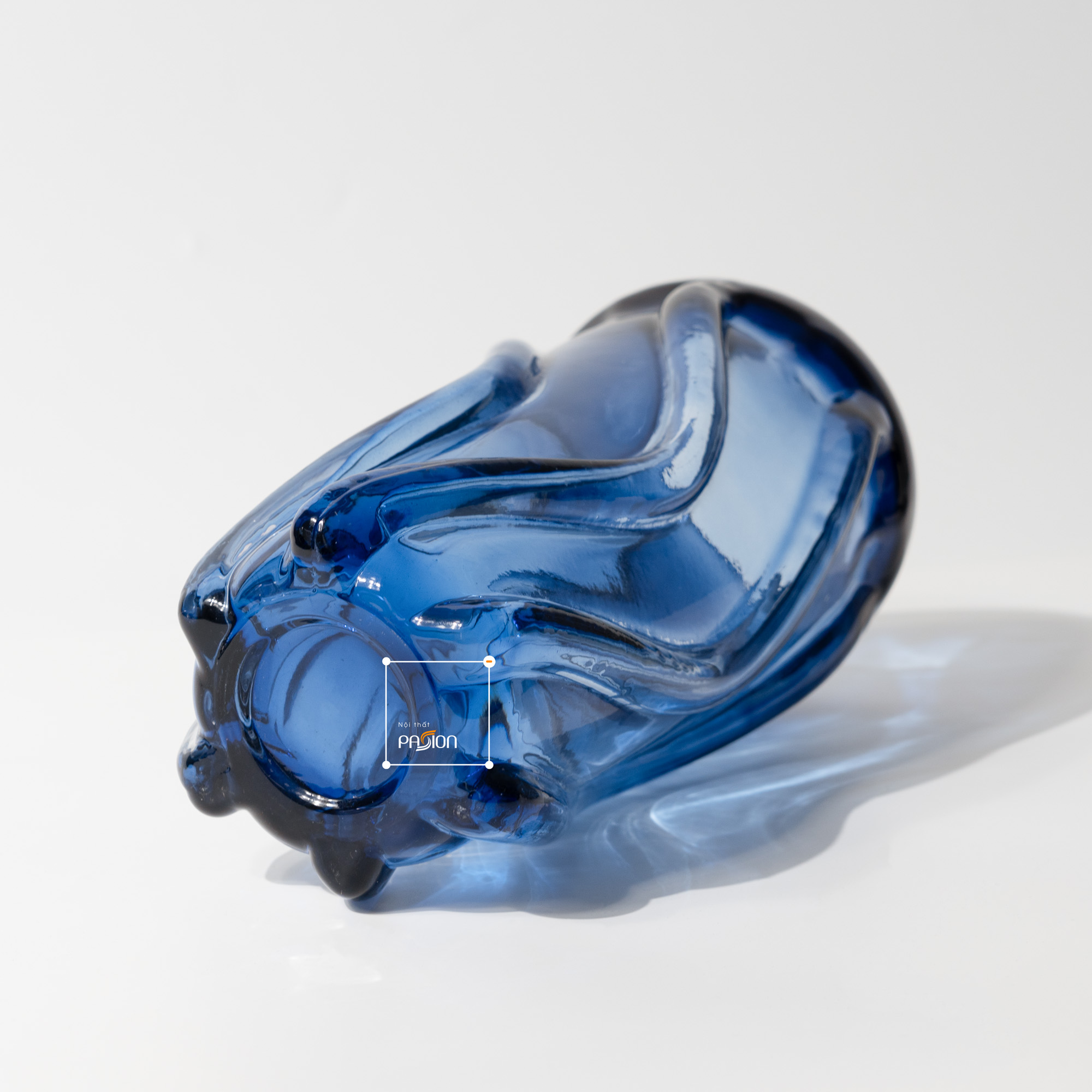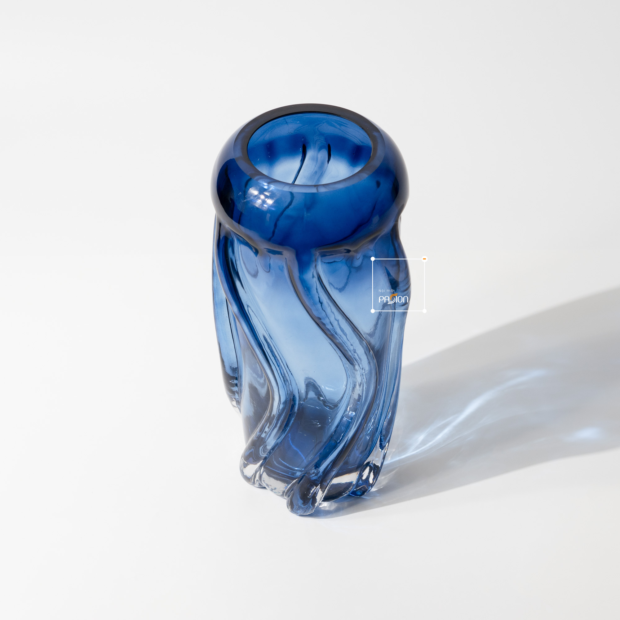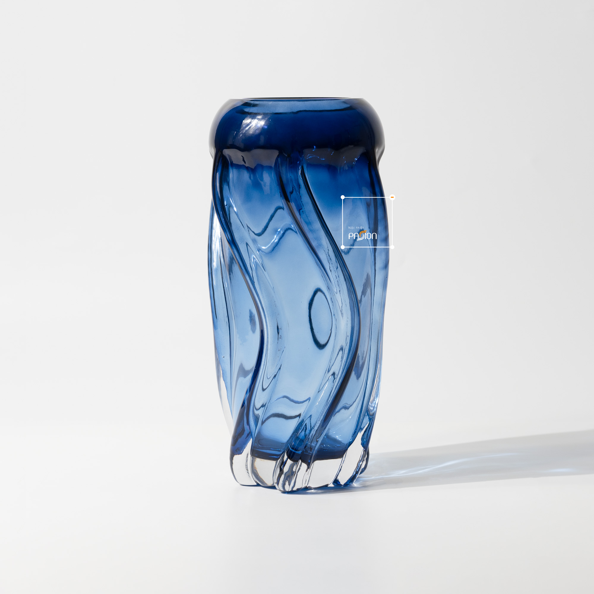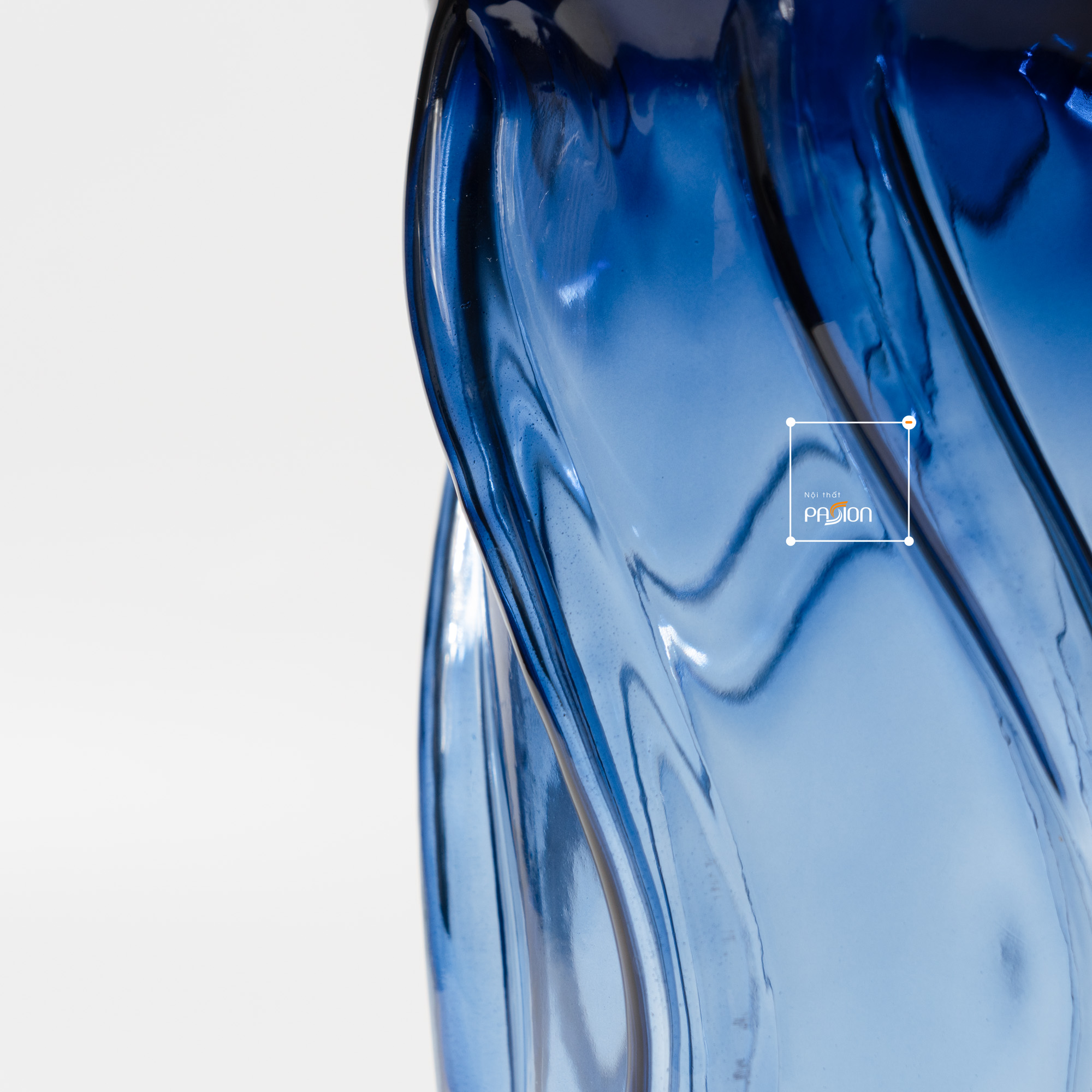Với thiết kế gợn sóng độc đáo, màu xanh dương chuyển sắc nhẹ nhàng và chất liệu thủy tinh cao cấp, chiếc bình không chỉ tạo điểm nhấn thị giác mà còn mang đến cảm giác thư thái, sang trọng cho không gian sống.