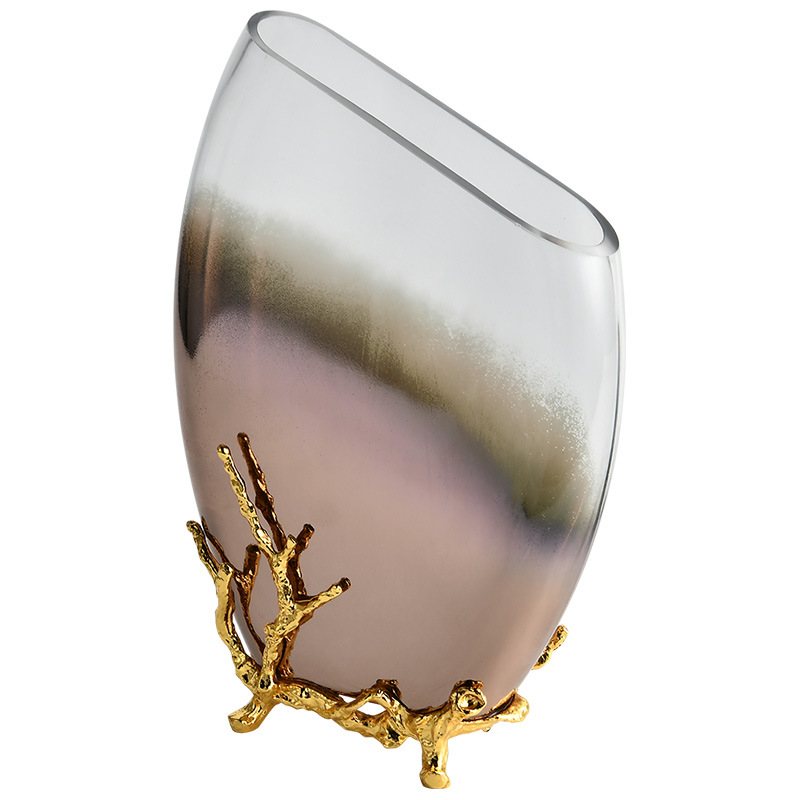 Thiết kế lấy cảm hứng từ sự chuyển sắc của ánh sáng trên thủy tinh, kết hợp chân đế kim loại mạ vàng, tạo sự cân bằng hoàn hảo giữa màu sắc và chất liệu, khiến bình hoa vừa hiện đại vừa tinh tế.