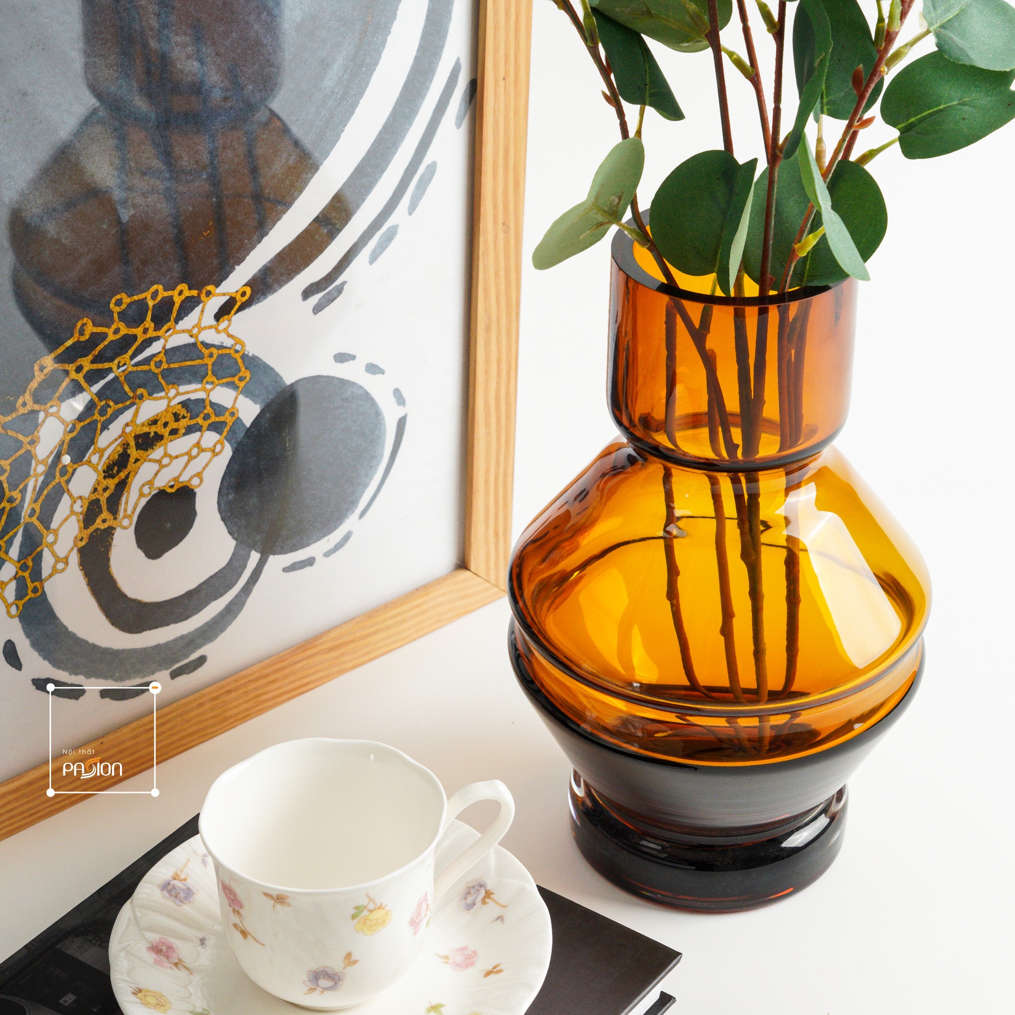 - Màu nâu thủy tinh độc đáo: Không giống như các loại bình thủy tinh trong suốt thông thường, chiếc bình này sở hữu màu nâu caramel trầm ấm, gợi cảm giác cổ điển nhưng không kém phần sang trọng. Màu sắc này cũng rất dễ kết hợp với các nội thất gỗ, da, hoặc kim loại trong các phong cách trang trí hiện đại, Bắc Âu, vintage hay retro.
