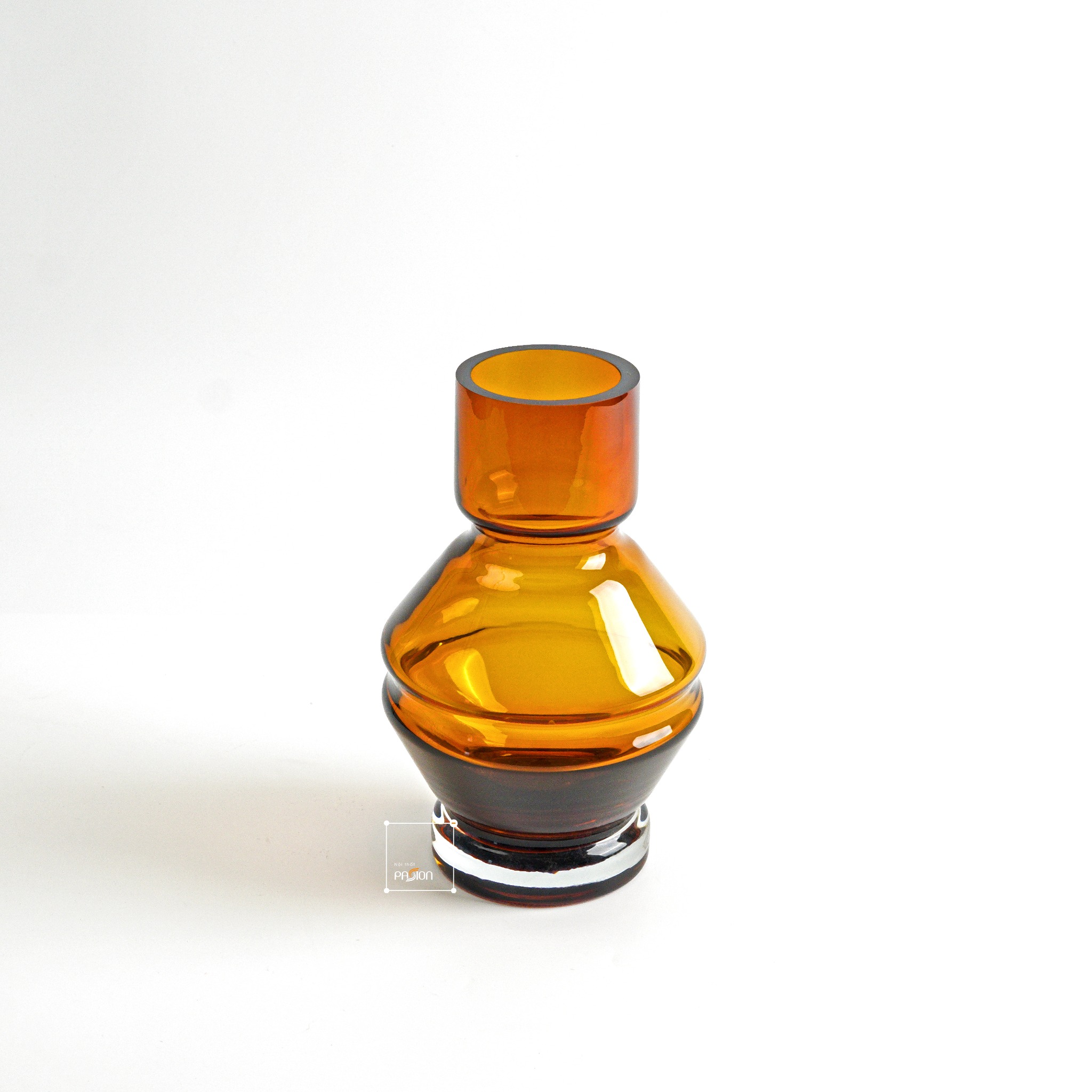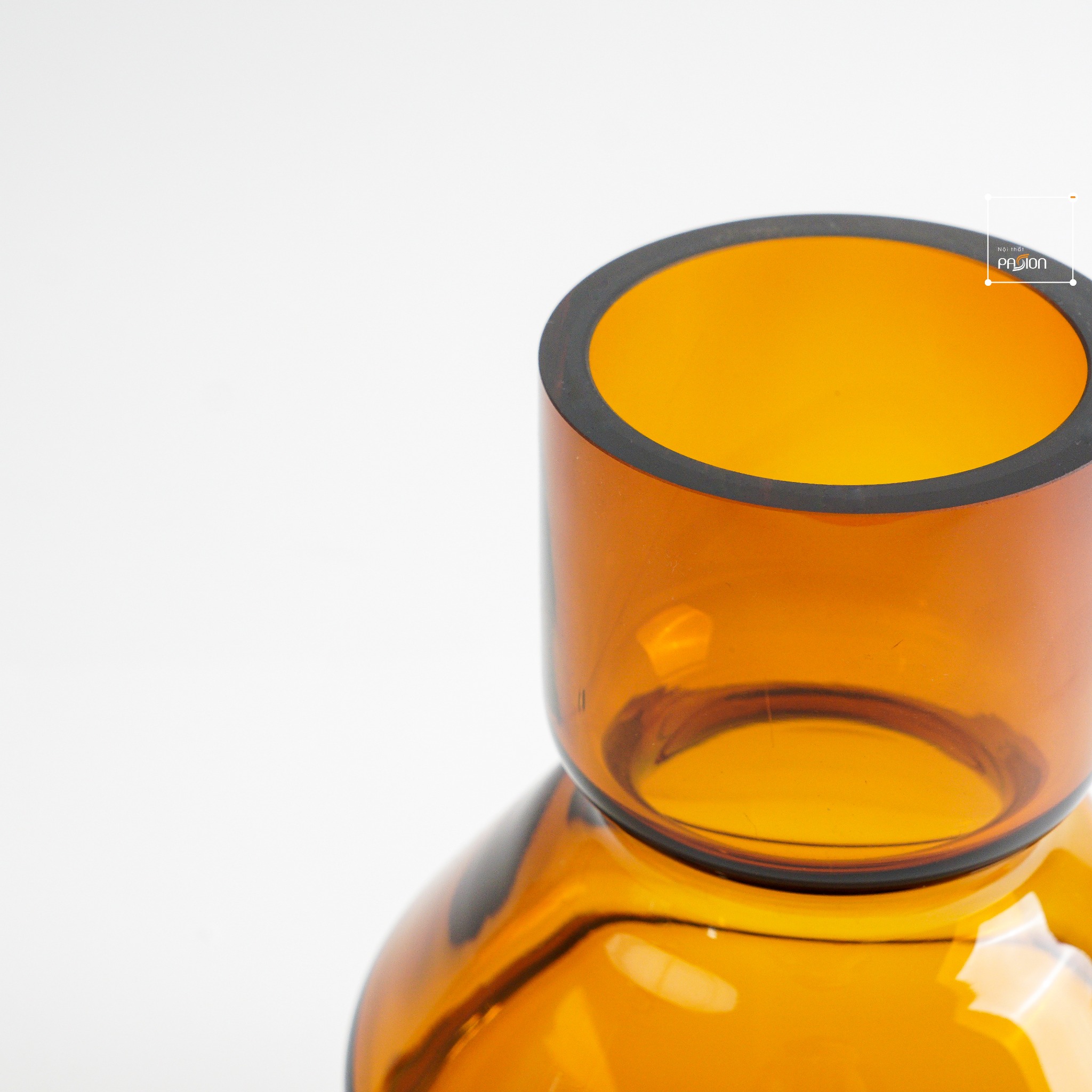 Chiếc bình thủy tinh nâu dày hình trụ bầu nhọn không chỉ đơn thuần là một vật chứa hay vật trưng bày, mà còn là một tác phẩm nghệ thuật thu nhỏ. Với chiều cao 26cm, đường kính 16.5cm, tỷ lệ hình học hài hòa giữa thân trụ và phần bụng phình to dần tạo nên sự cuốn hút thị giác đặc biệt.