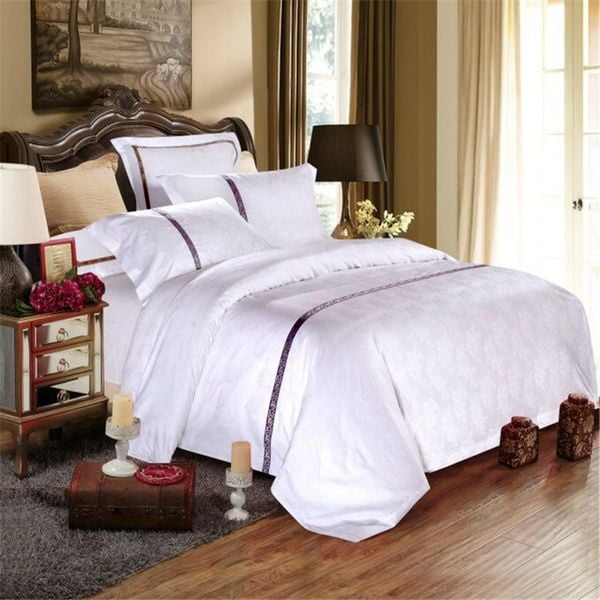 Nếu không gian phòng ngủ nhà bạn được thiết kế theo phong cách hiện đại, trang trọng thì bộ drap giường này chính là lựa chọn hoàn hảo dành cho bạn. Với thiết kế hiện đại, họa tiết trắng hoa văn mang đến không gian tinh tế và nhẹ nhàng. Bạn cũng có thể sử dụng mẫu drab giường này cho những khách sạn sang trọng cũng sẽ rất phù hợp.