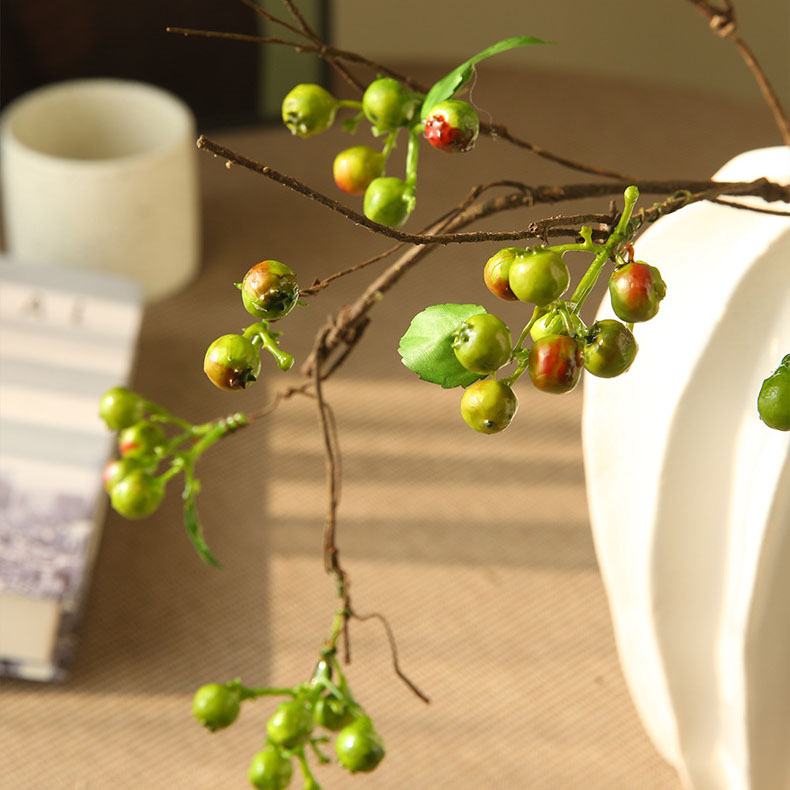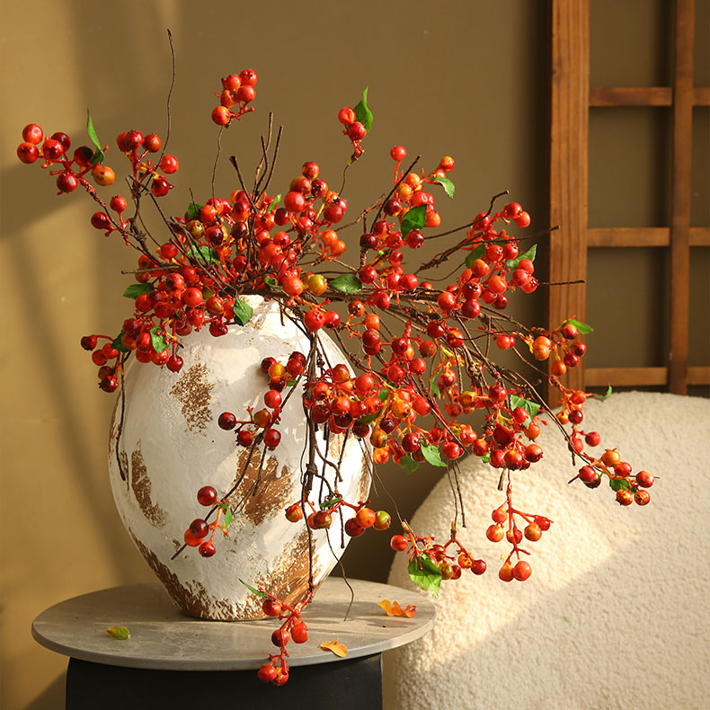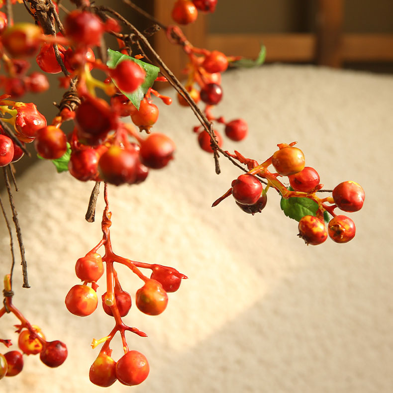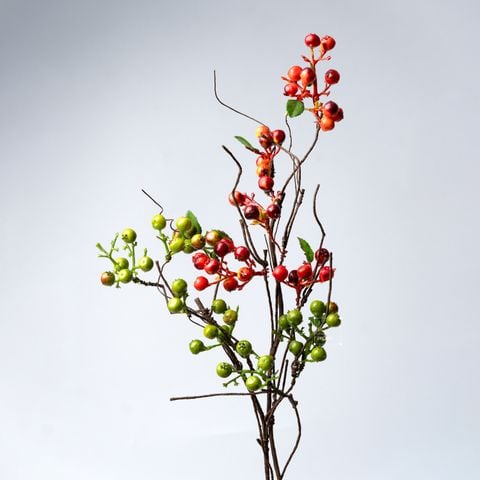 Cành cây quả berry là lựa chọn lý tưởng để tạo điểm nhấn cho không gian. Những quả berry đỏ tươi tắn sẽ làm nổi bật bất kỳ góc nhỏ nào trong nhà, từ bàn trà, kệ tivi, đến cửa sổ hay bàn ăn. Hoa quả berry còn có thể dễ dàng kết hợp với các loại hoa giả khác để tạo thành một cụm hoa nhiều màu sắc, tăng thêm phần sinh động và tươi mới cho không gian sống.