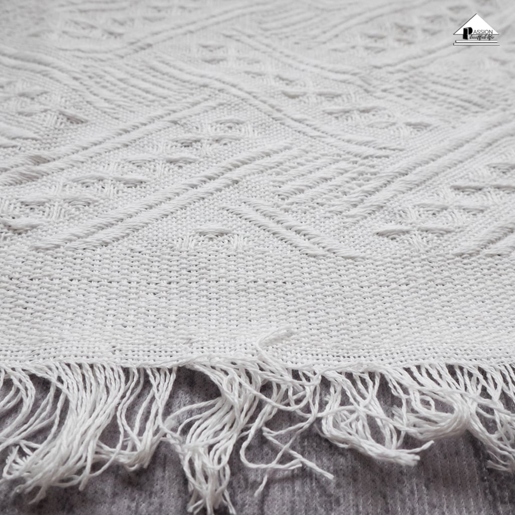 Chăn thảm phủ ghế sofa đan len tua rua màu trắng lưới