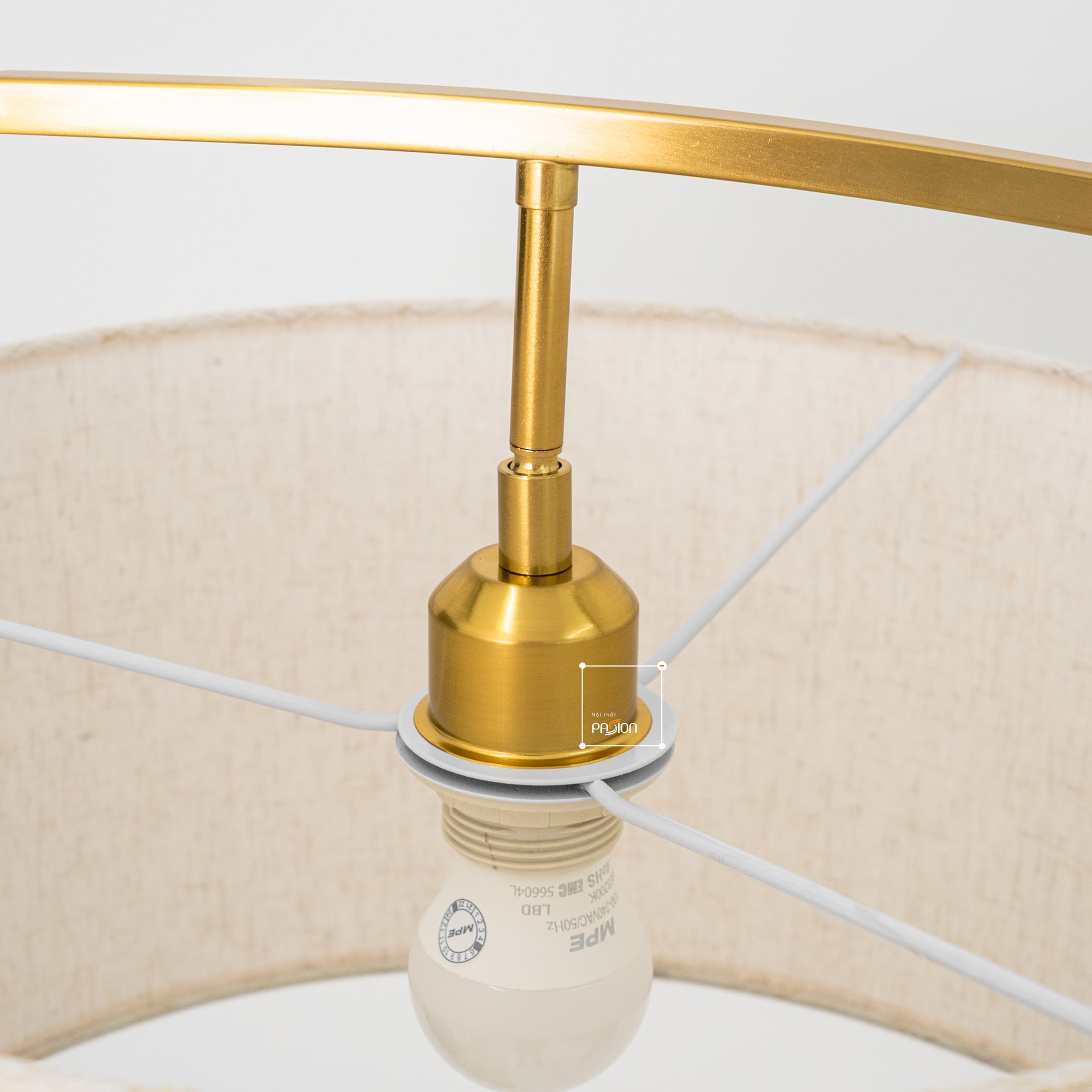 - Thân đèn kim loại: Chiếc đèn được chế tác từ kim loại cao cấp, sơn đen mờ phối viền vàng đồng nổi bật. Sự kết hợp này không chỉ tạo cảm giác sang trọng, mà còn gia tăng độ chắc chắn và độ bền vượt trội cho sản phẩm. Khung đèn vững chãi nhưng vẫn giữ được độ thanh mảnh vừa phải, dễ dàng phối hợp với các loại nội thất khác.