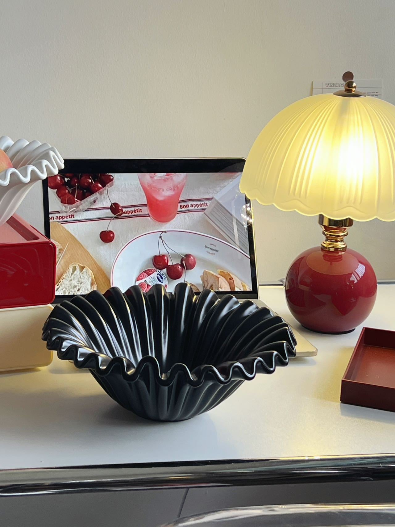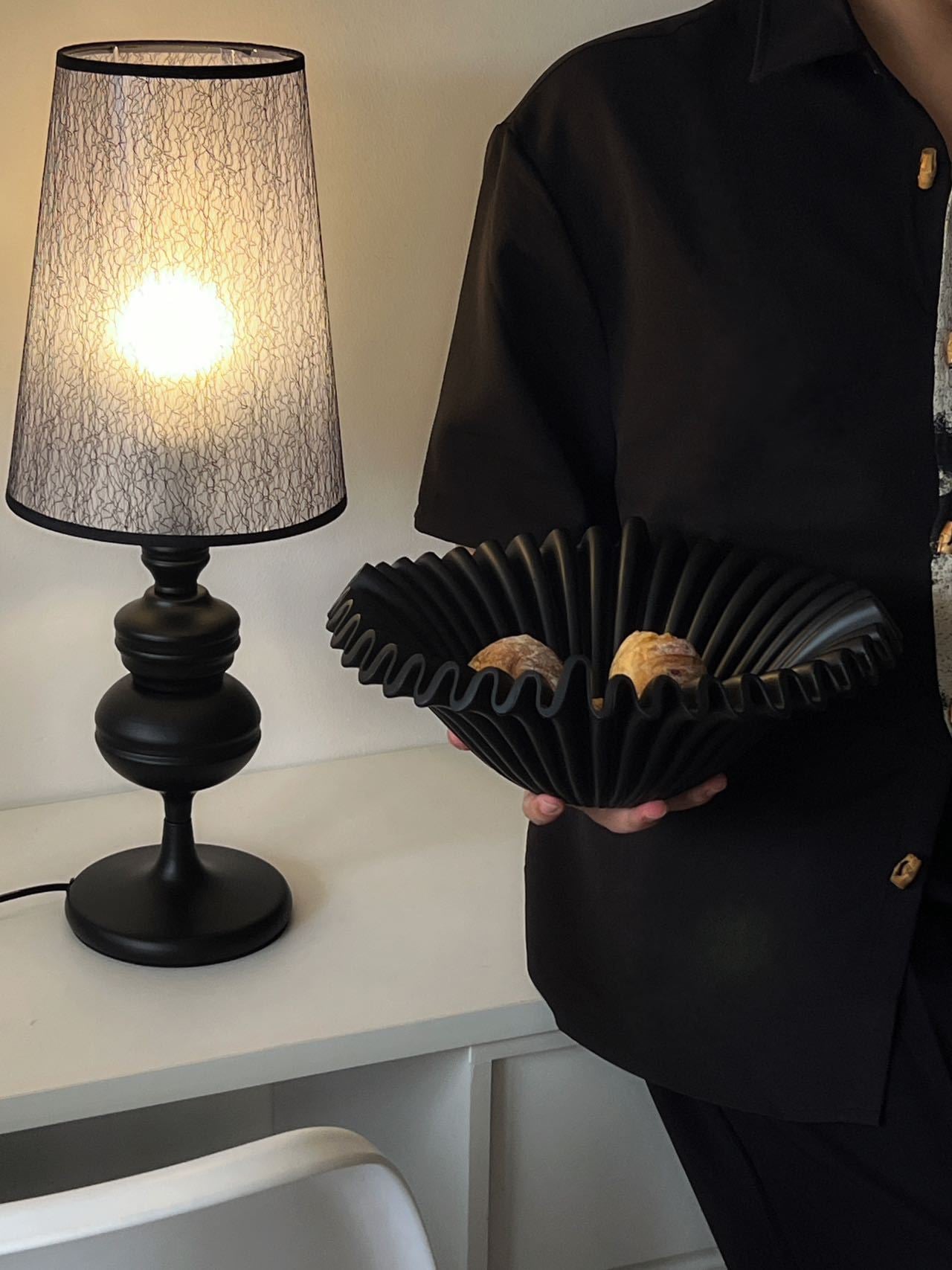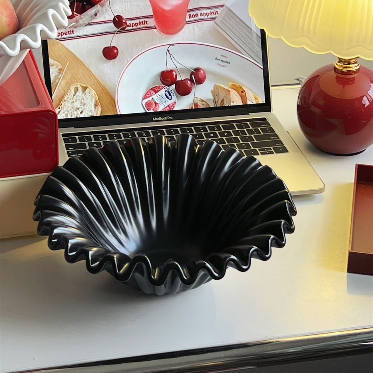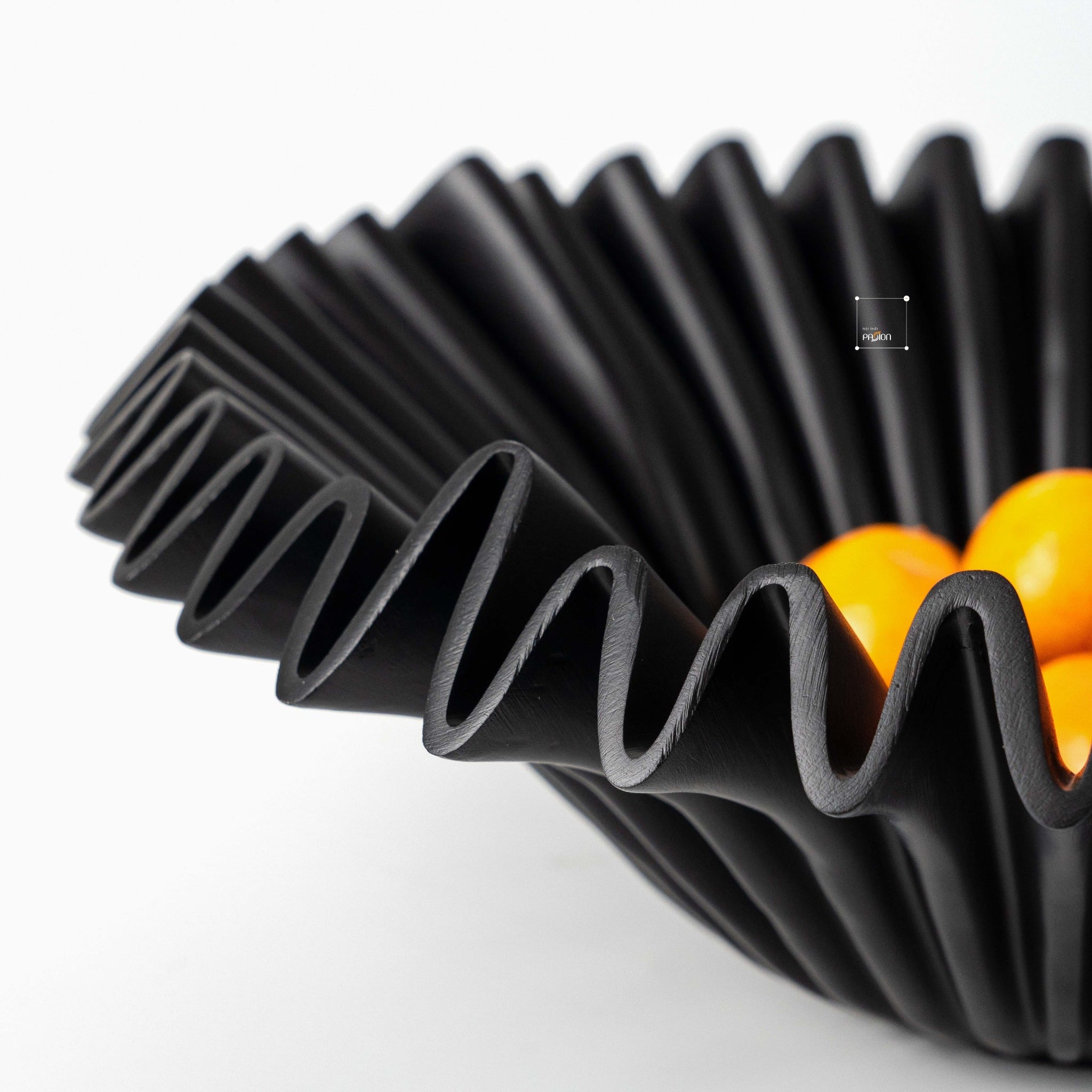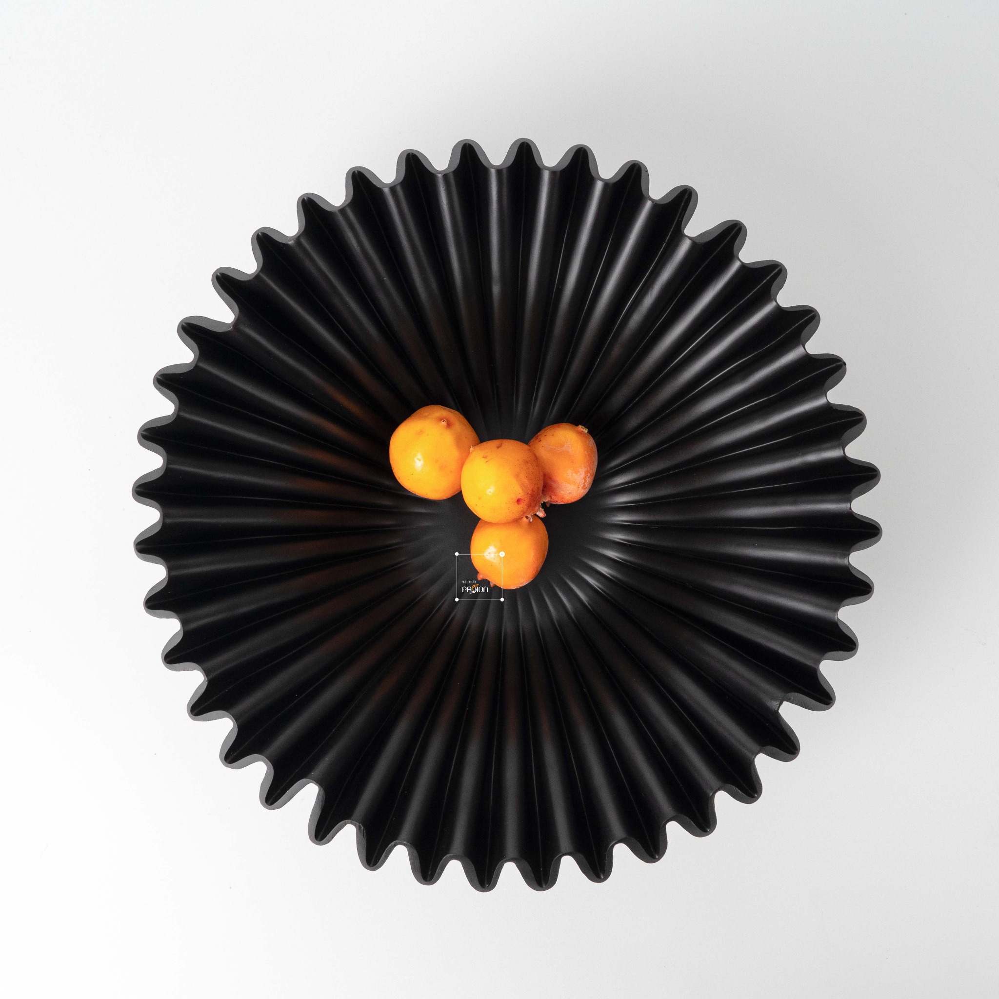 Dĩa trái cây với thiết kế gợn sóng là điểm nhấn nổi bật, giúp không gian sống trở nên sang trọng và thu hút hơn.