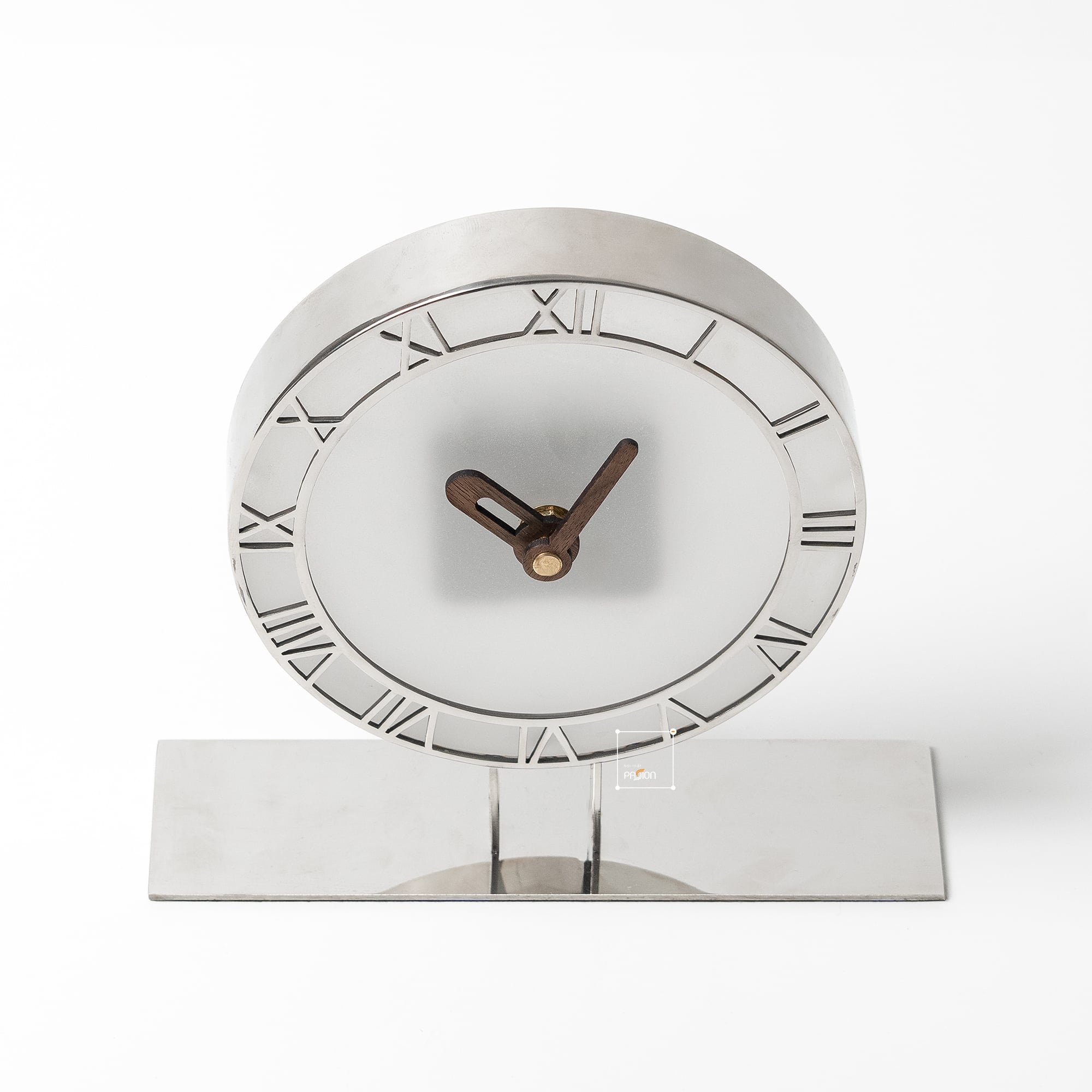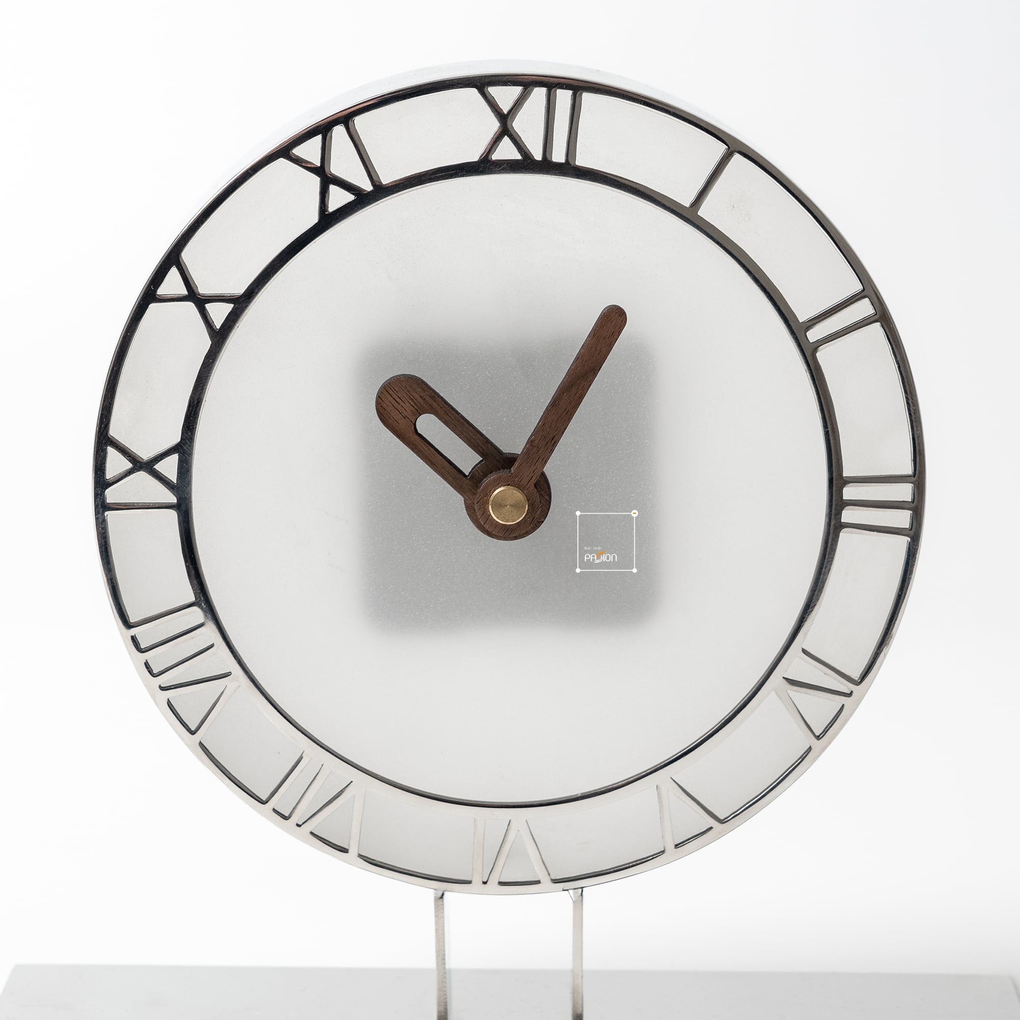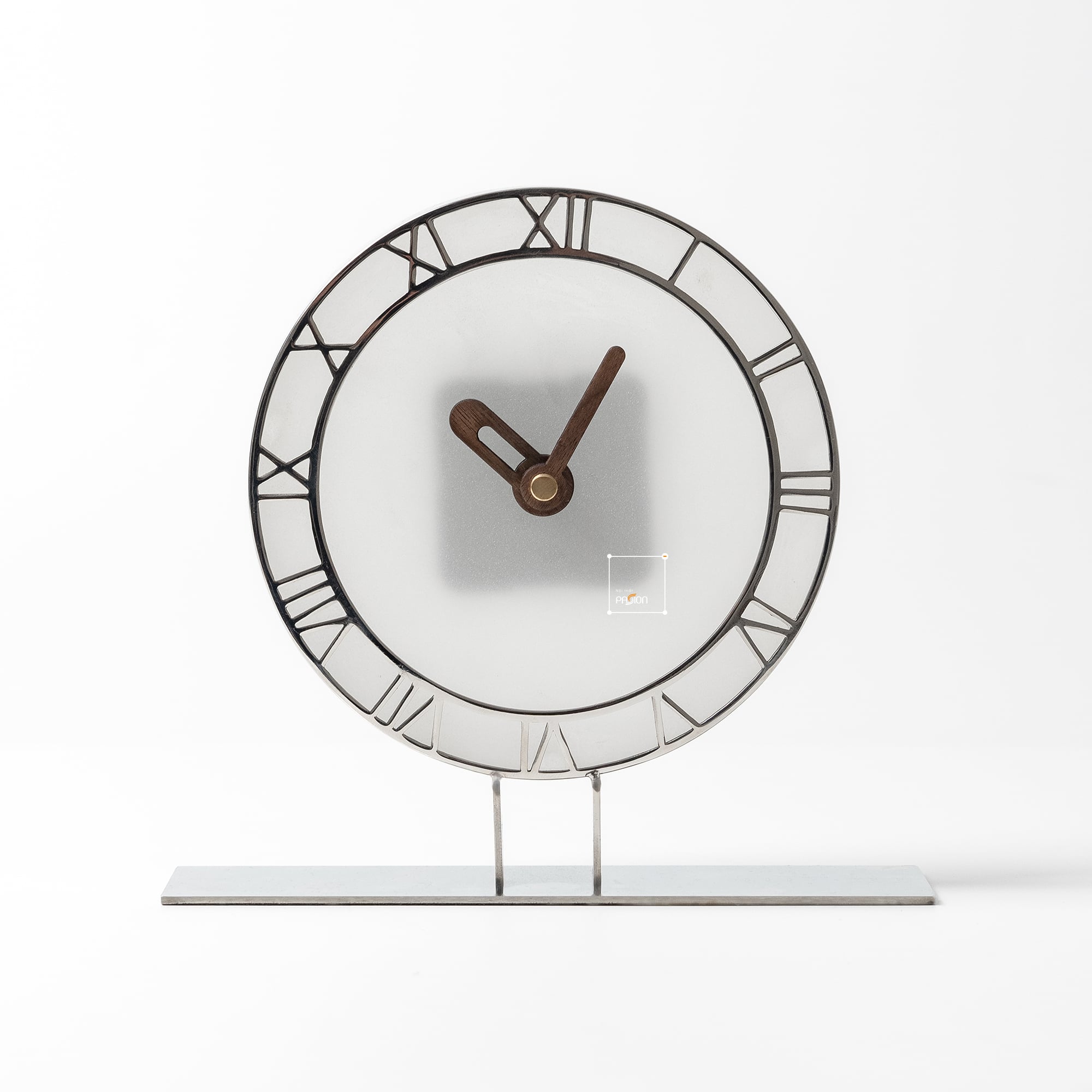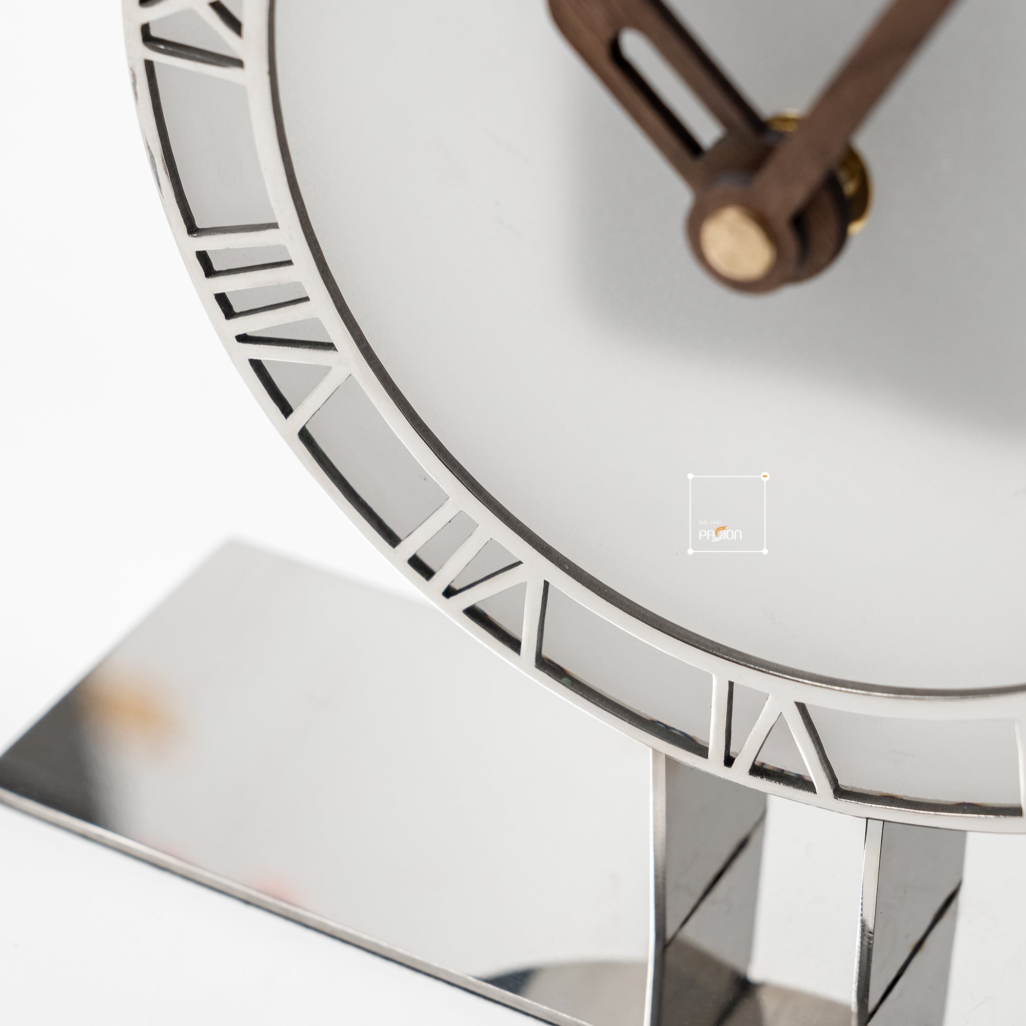 - Thiết kế mở: Khung kim loại viền quanh mặt đồng hồ được chế tác theo phong cách bán cổ điển với các chữ số La Mã cách điệu, tạo cảm giác như chiếc đồng hồ đang “lơ lửng” giữa không gian. Phần nền đá phía sau có vân mây mờ ảo tạo chiều sâu và cảm giác chuyển động tinh tế. Chân đế kim loại phẳng được gắn trực tiếp vào mặt đá cẩm thạch vững chắc, hoàn thiện tổng thể một cách chỉn chu.