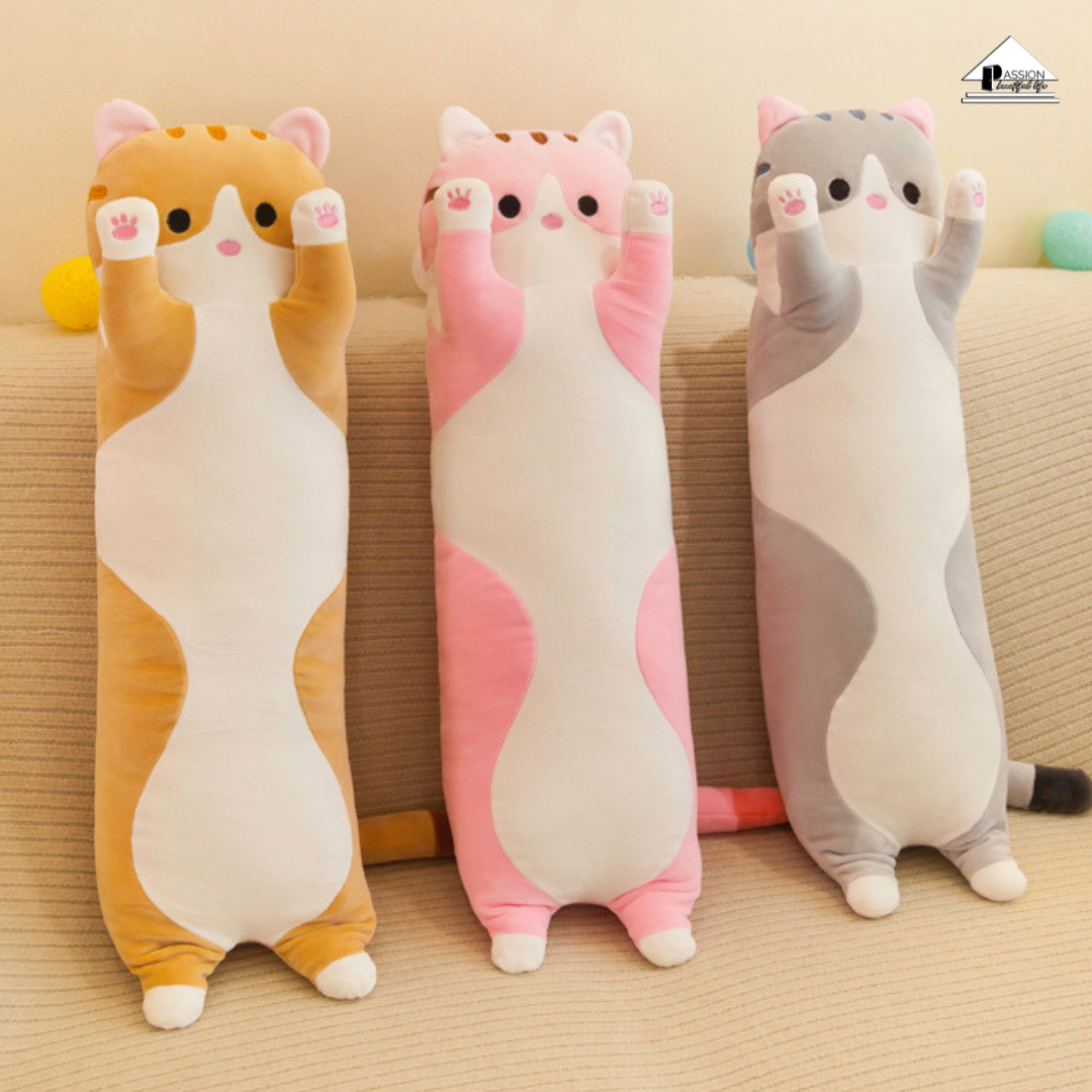 Gối Ôm Gấu Bông Mèo Dài Bông Tuyết Siêu Mịn với thiết kế hoạt hình đơn giản dễ thương cùng lông nhung mềm mịn.