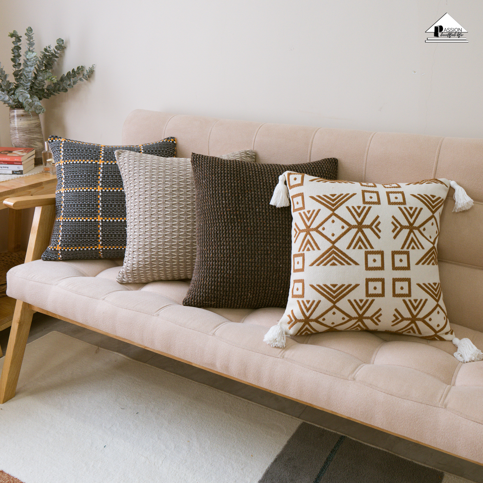 Vỏ gối tựa lưng nhà Passion được làm bằng chất liệu vài linen dệt mềm mại, thiết kế tinh tế. Những chi tiết in nổi vô cùng sang trọng, kết hợp tua rua độc đáo, lạ mắt.
