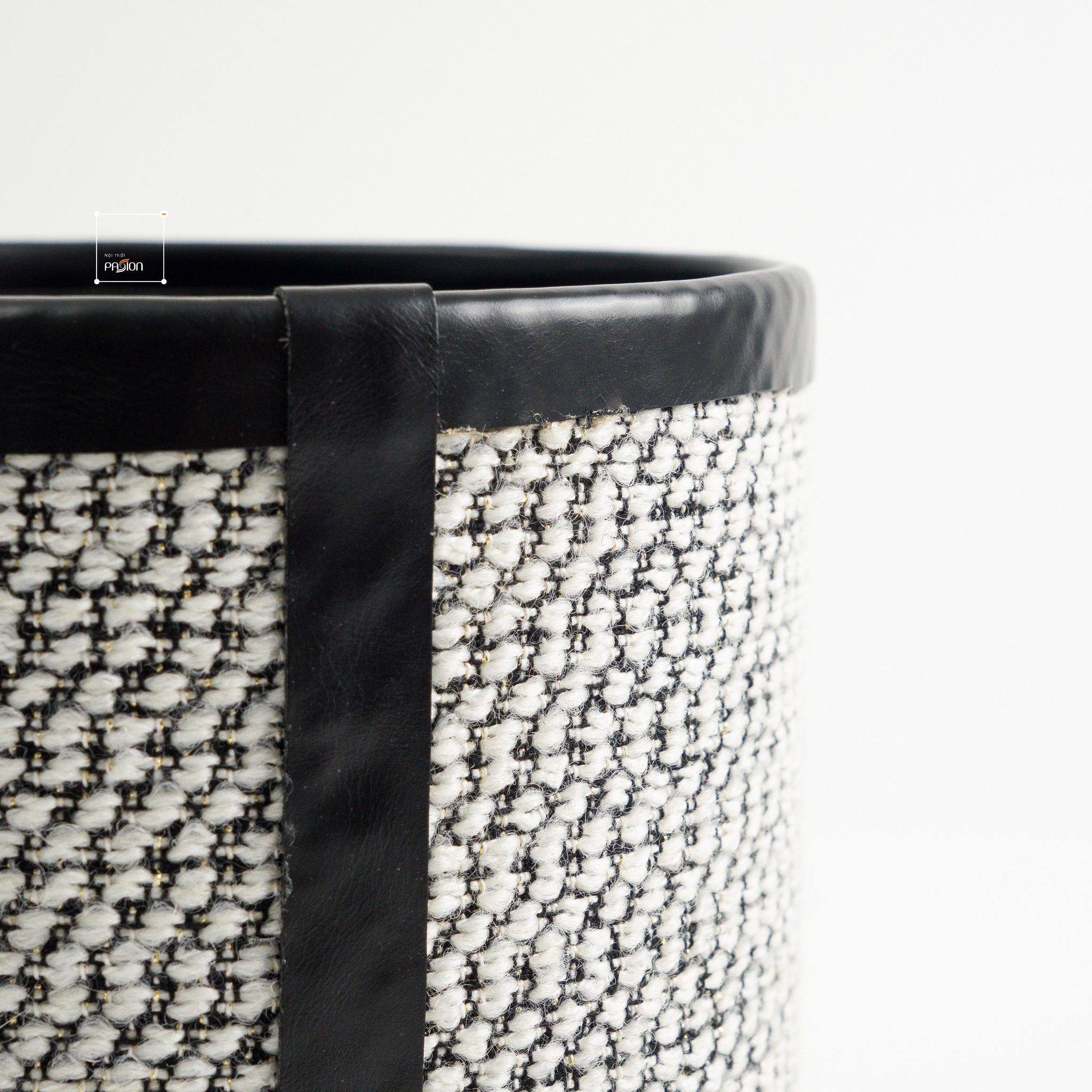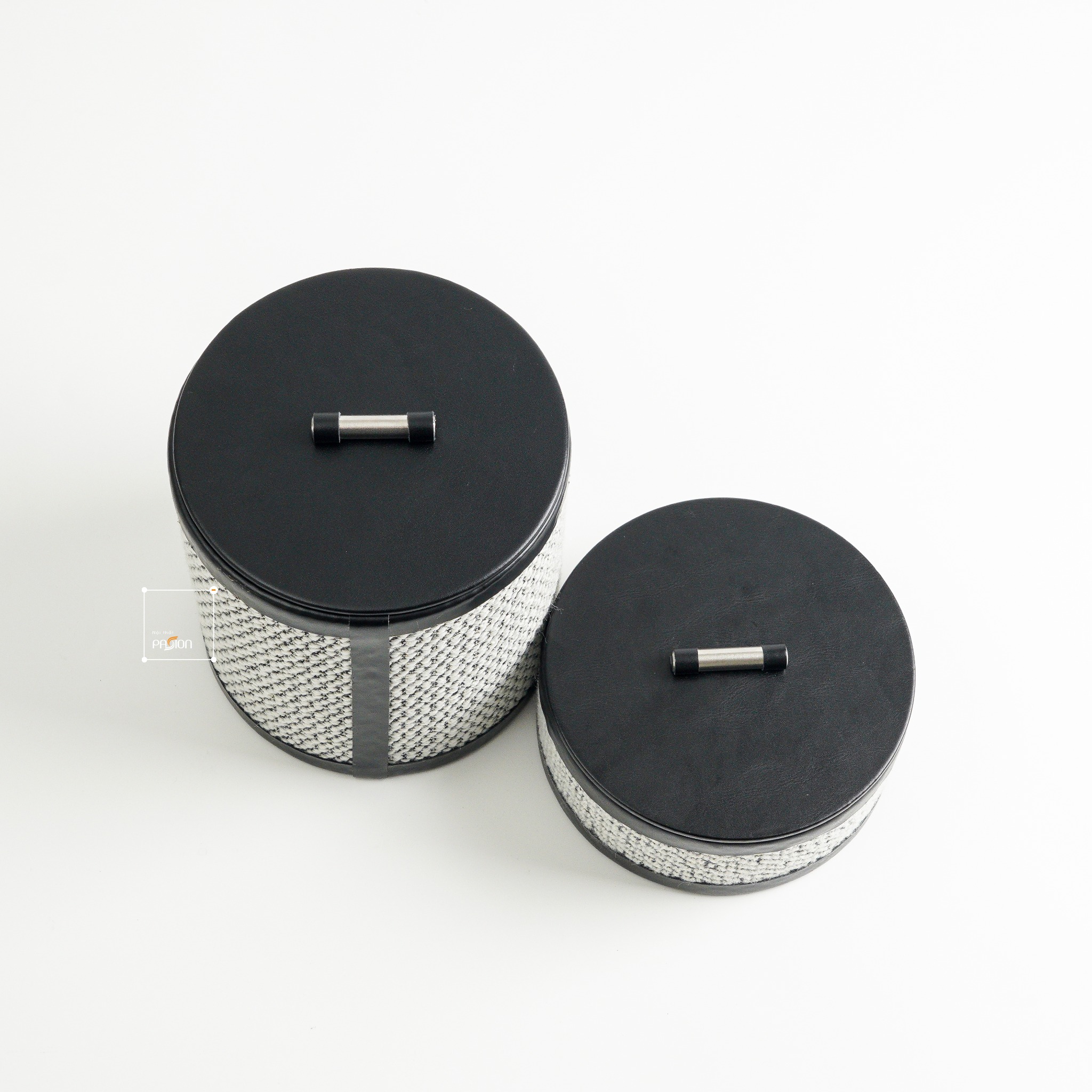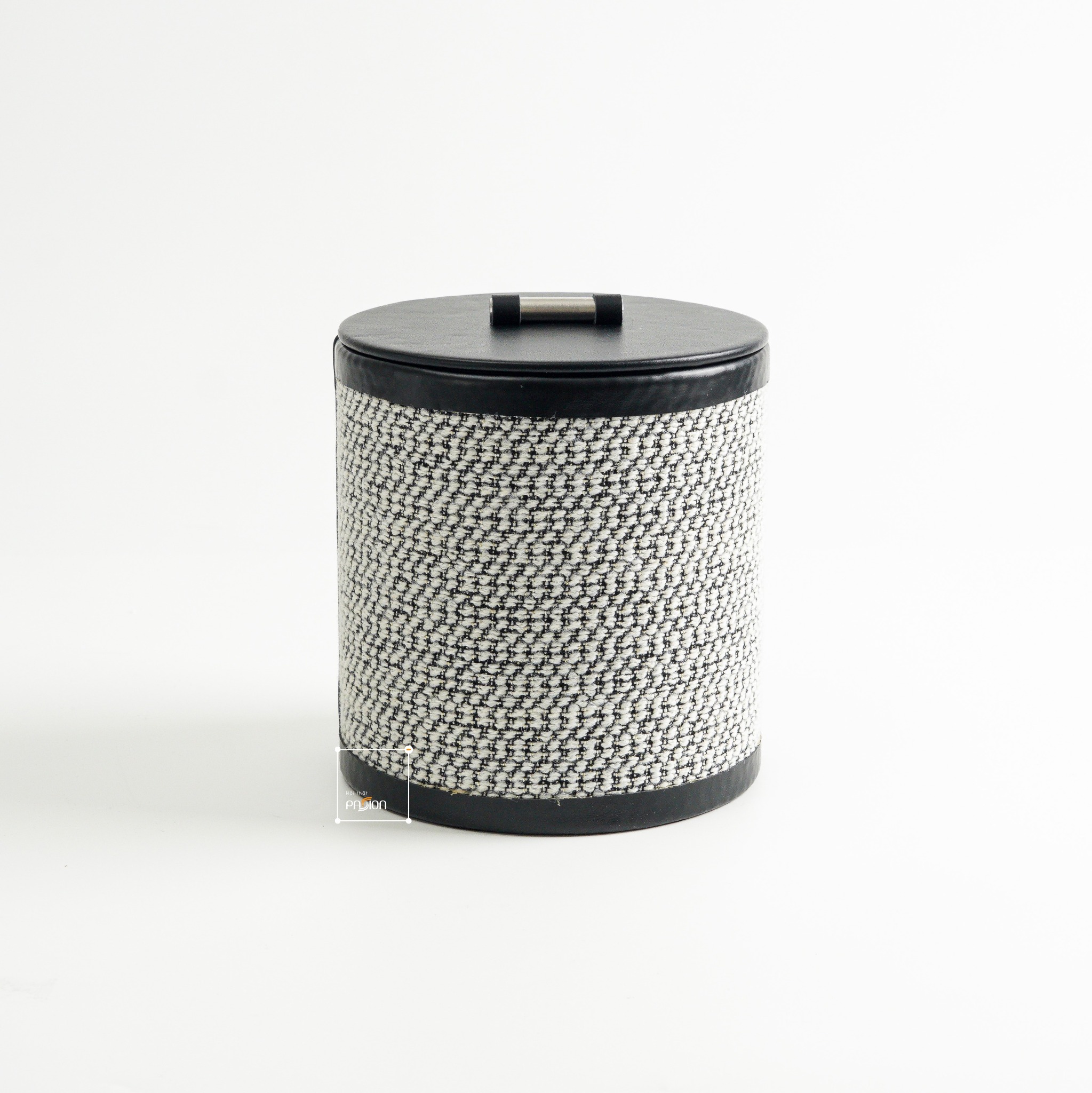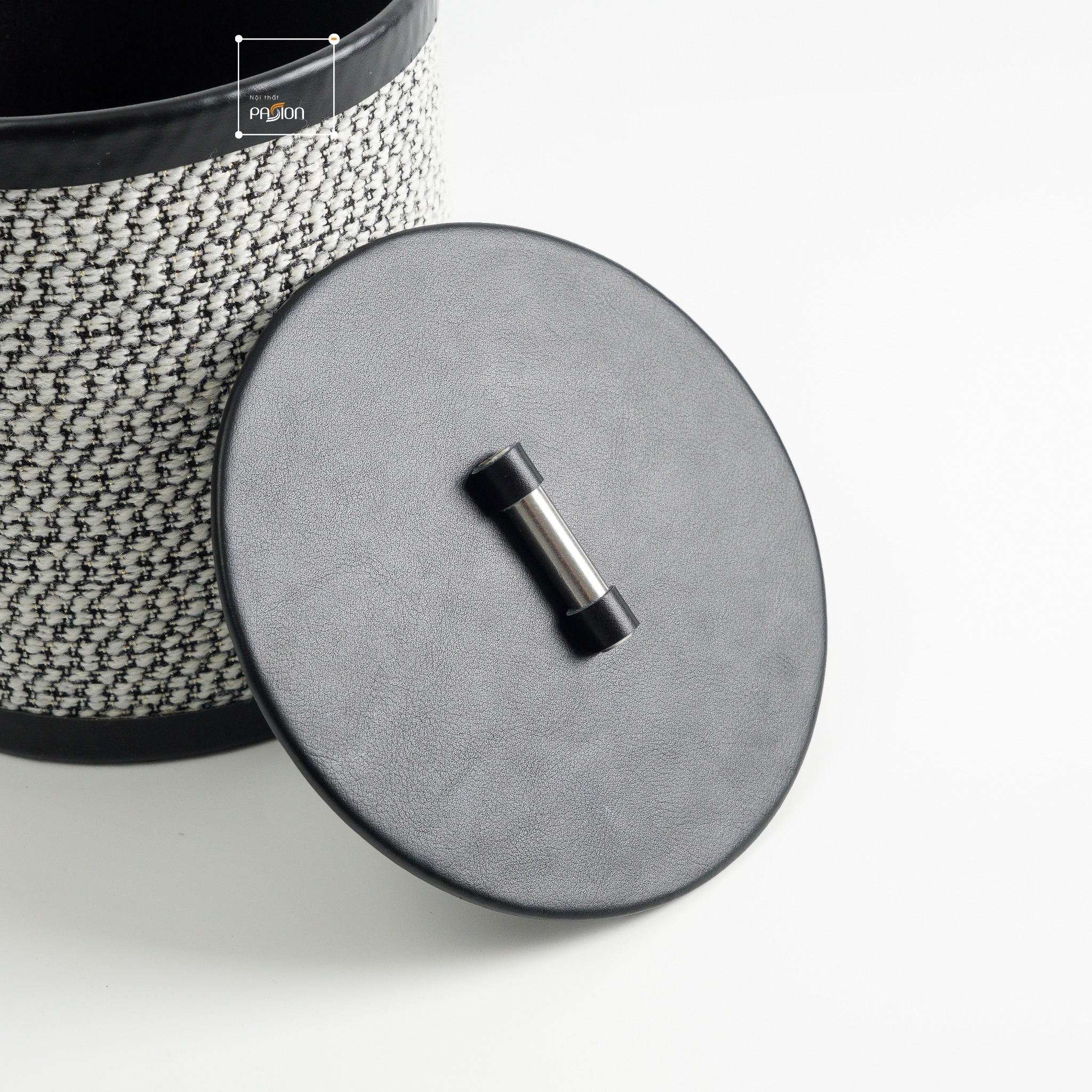 - Thiết kế hiện đại, phối da kiểu Ý tinh xảo: Hộp có hình trụ với đường nét tròn trịa, mềm mại, được phủ lớp da cao cấp phối cùng vải dệt họa tiết nổi. Mặt ngoài là sự kết hợp độc đáo giữa họa tiết vải đen trắng sang trọng và viền da trơn tạo độ bóng nhẹ - chi tiết rất đặc trưng trong thiết kế nội thất kiểu Ý. Nắp hộp được làm đồng bộ với phần thân, nổi bật với tay cầm kim loại đen bạc thời thượng. Tay cầm này không chỉ để tiện mở nắp mà còn tăng tính nghệ thuật, giống như một điểm chốt trong tổng thể thiết kế.