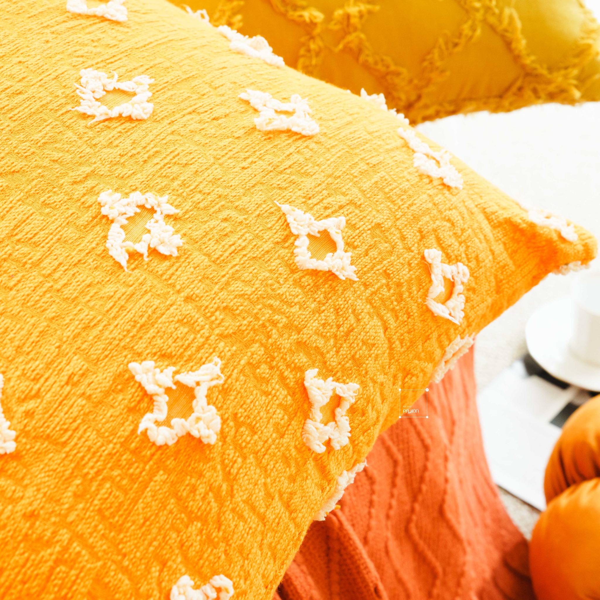 Một trong những điểm độc đáo của sản phẩm chính là sự kết hợp giữa gối tựa lưng và khăn phủ sofa. Đây là sự phối hợp hoàn hảo để tạo nên một không gian sống đồng bộ và thống nhất về phong cách: