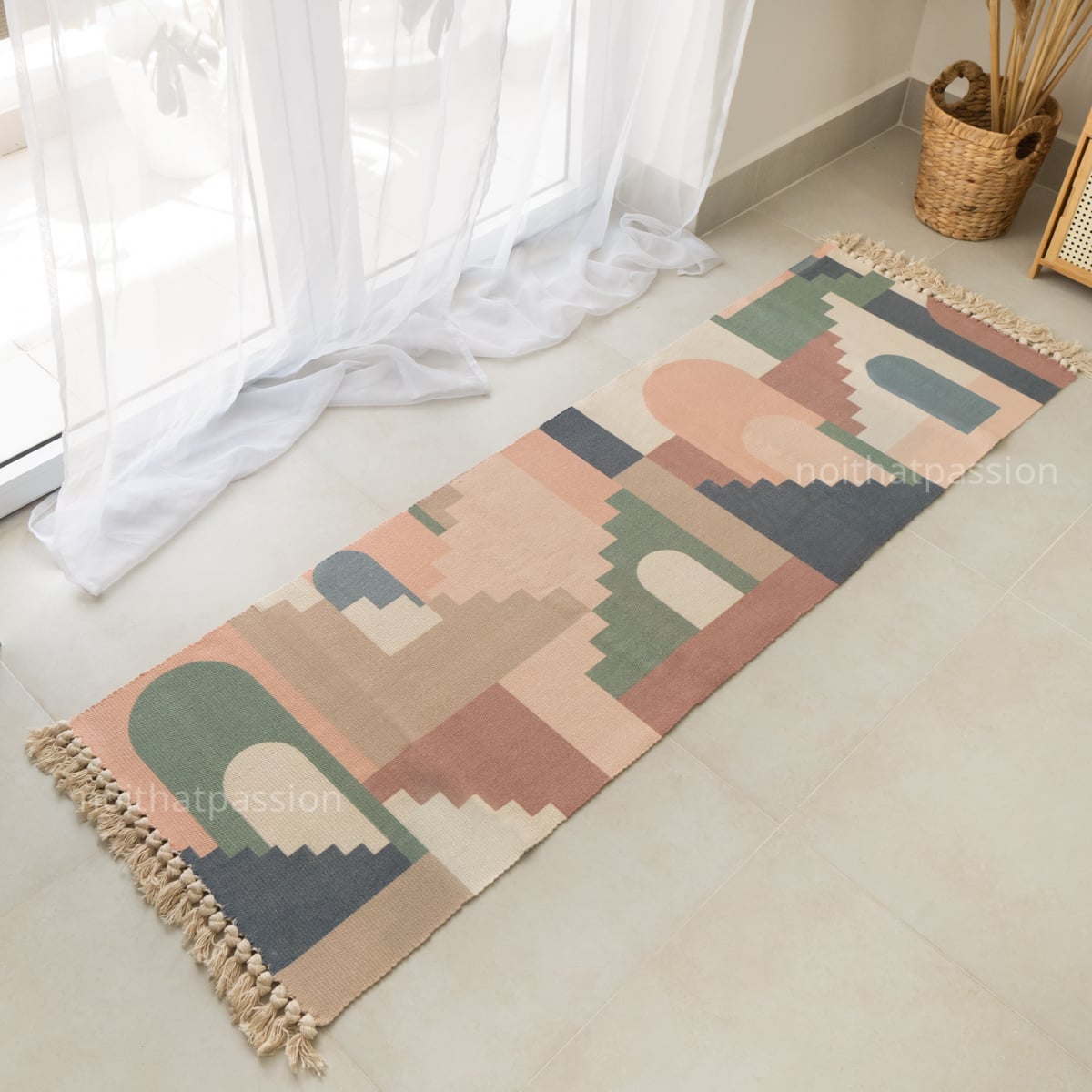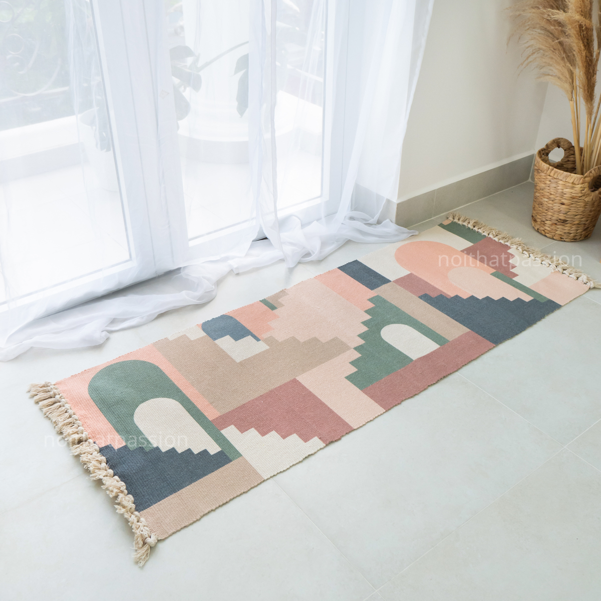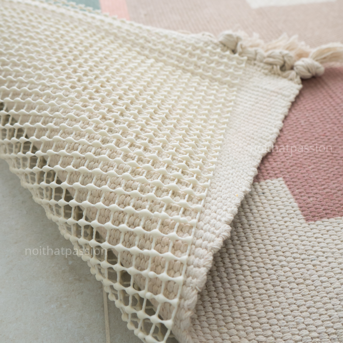 Thảm Canvas Trải Giường Ghế Sofa Trang Trí Màu Trừu Tượng được in màu trên lớp vải canvas sang trọng, hai bên phối tua rua tạo nên không gian sống vô cùng vintage và cá tính.