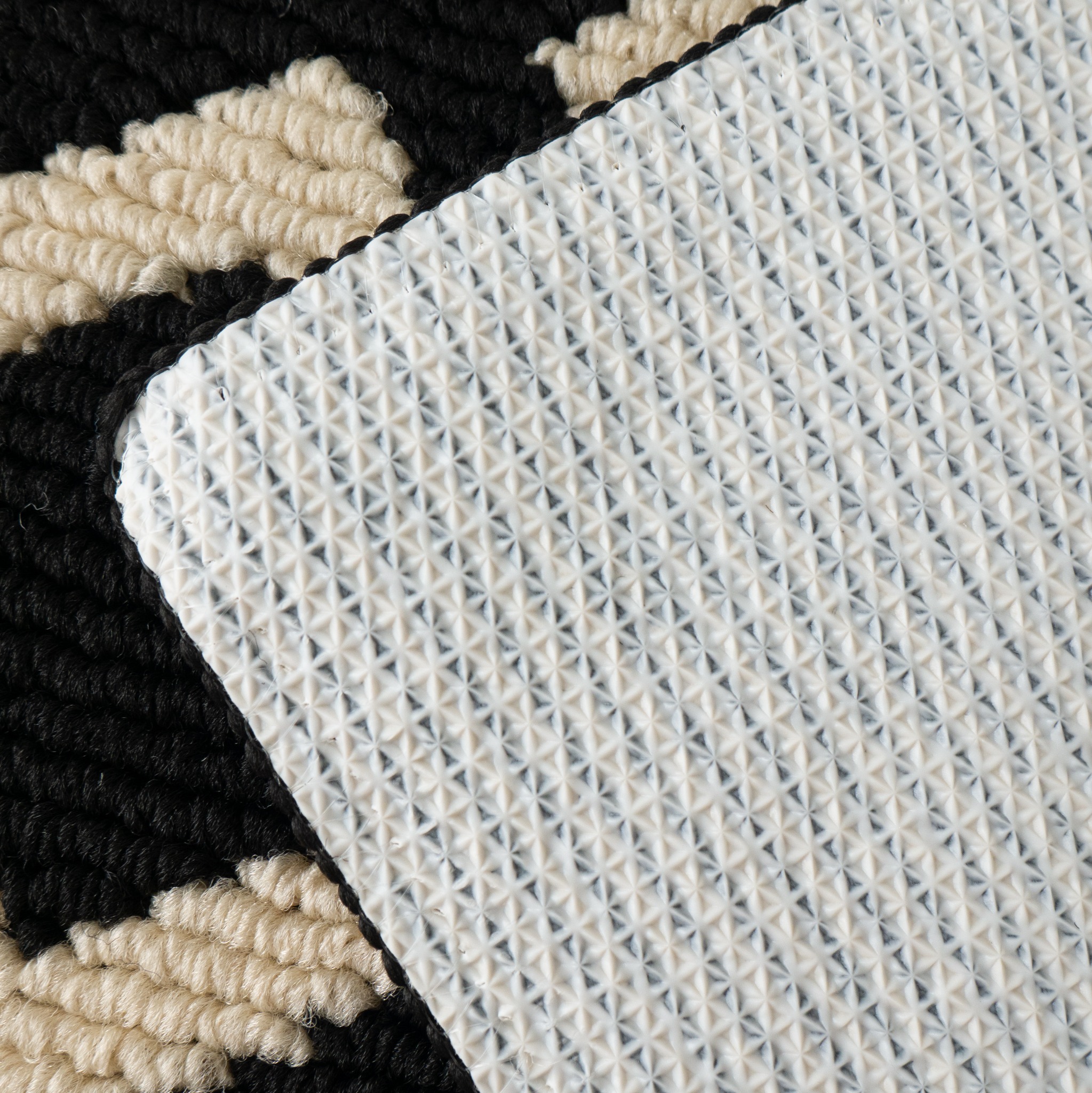 Thảm sàn phòng tắm họa tiết hình học xám đen có mặt sau chống trượt để tránh thảm bị dịch chuyển và trượt. Chất liệu cao su ngăn nước thấm vào bề mặt mềm.