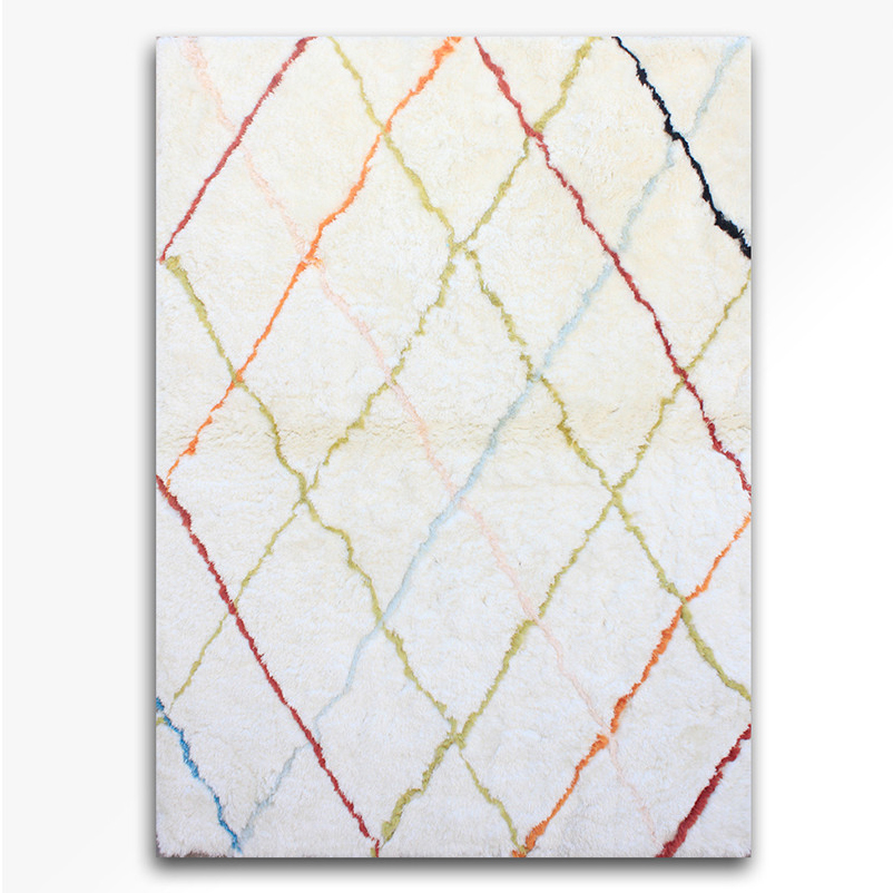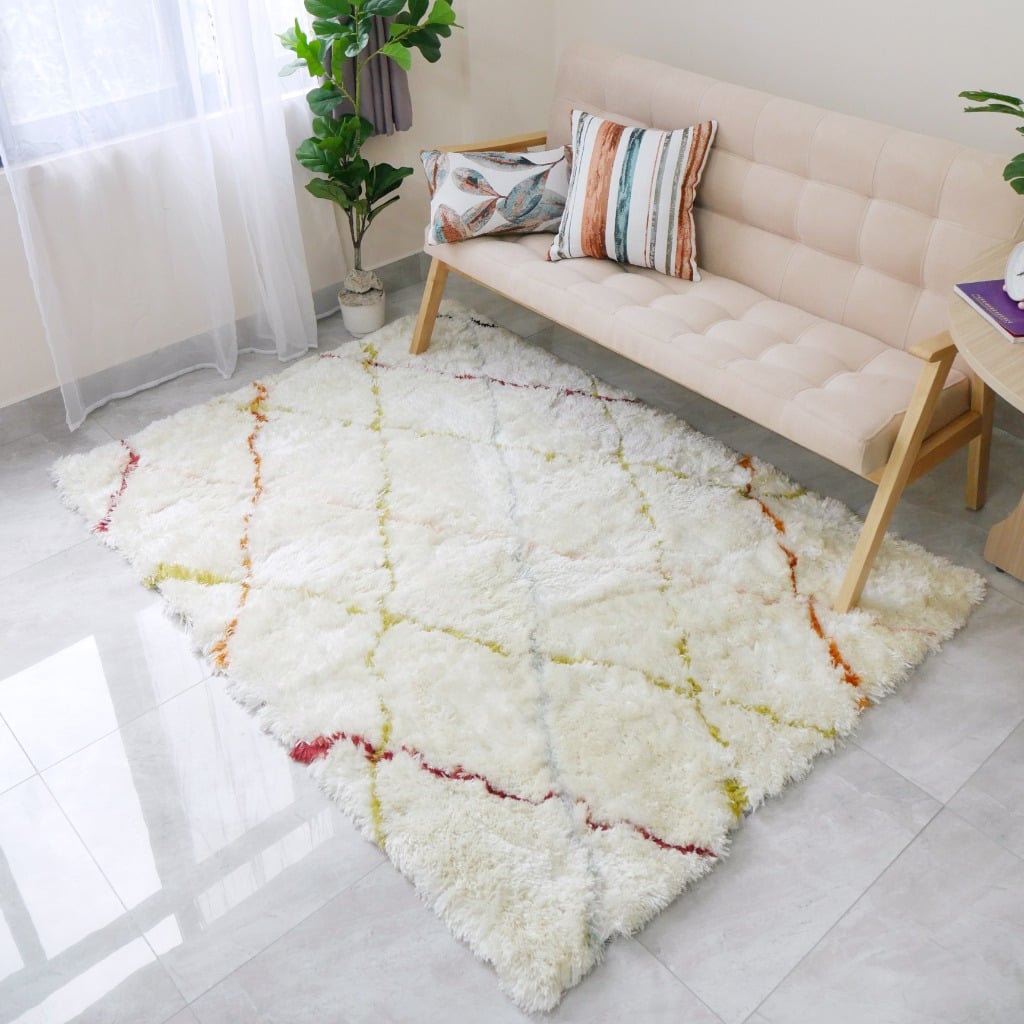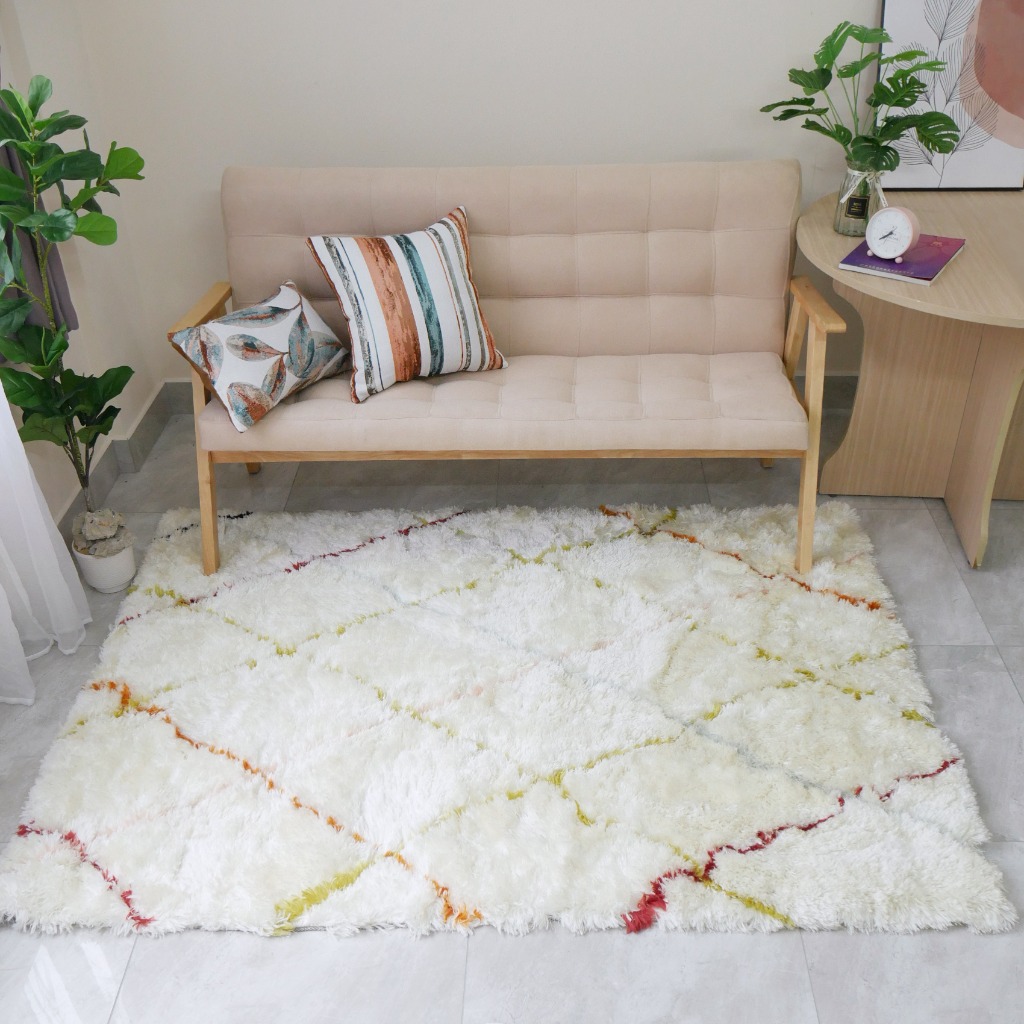 Sắc Trắng được chọn làm nền đã giúp trung hòa những gam màu mạnh mẽ và đem lại sự hài hòa cho toàn bộ diện mạo của Thảm Lông Cừu Dệt Sợi Xịn Mịn Họa Tiết Hình Học Màu. Vì thế, với vẻ ngoài "chất chơi" Thảm Lông Cừu Passion dễ dàng thích hợp với phong cách nội thất của người mua.