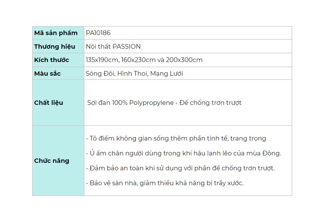 Thêm vào đó, phần đế của Thảm có khả năng chống trơn trượt rất hiệu quả, đảm bảo an toàn cho mọi thành viên trong gia đình, đặc biệt những ngôi nhà có trẻ nhỏ. Bạn không cần lo lắng quá nhiều về khả năng xảy ra những tai nạn té ngã khi sử dụng Thảm Passion.