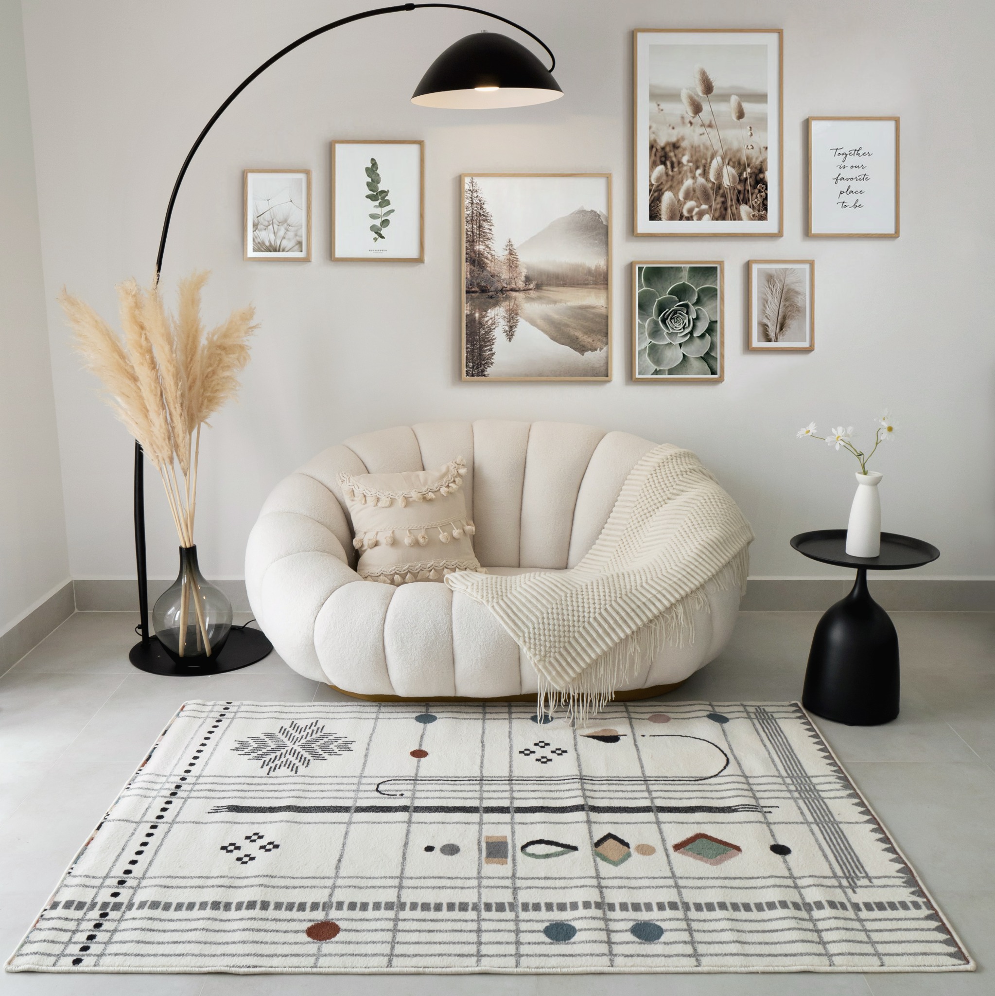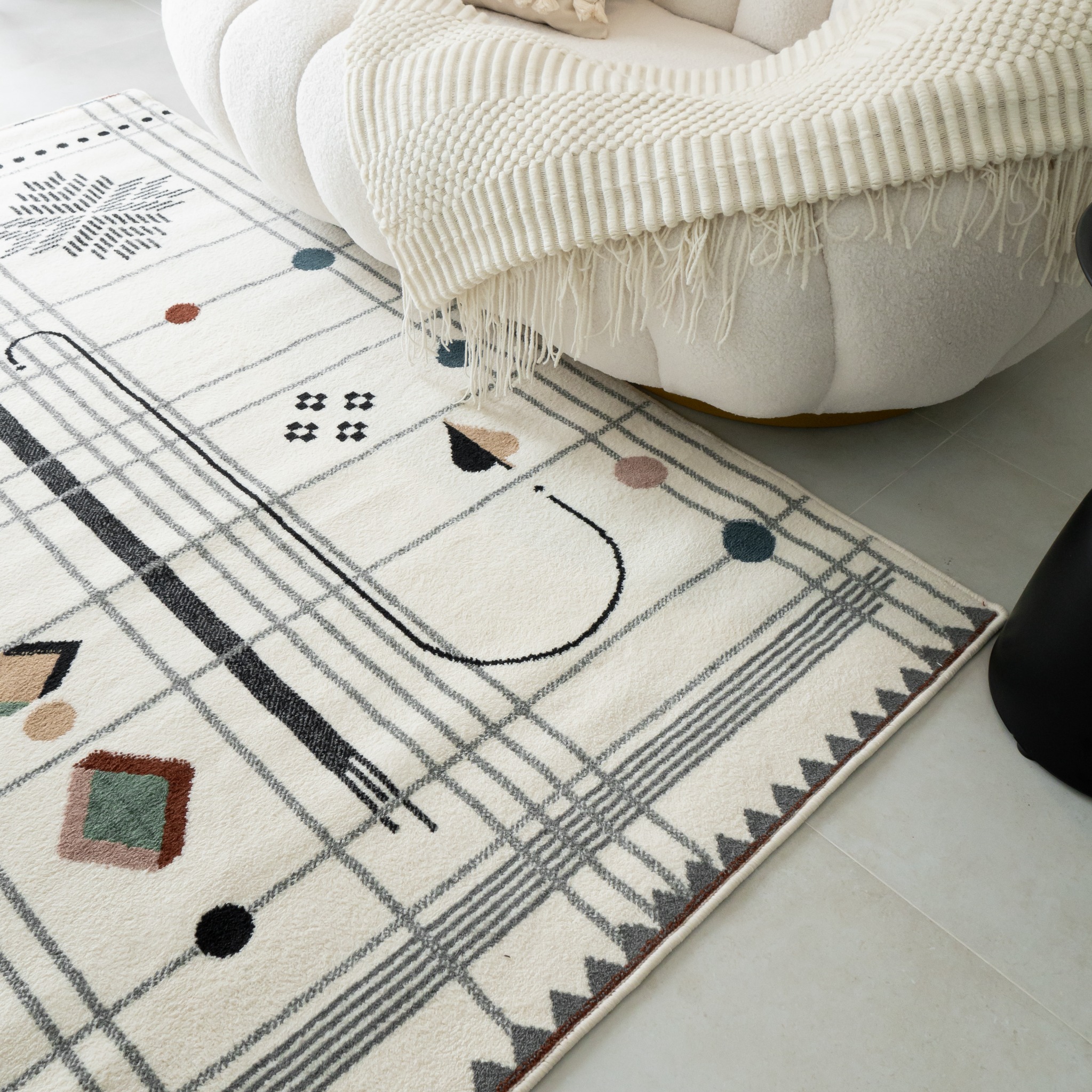 Kết hợp giữa đường line và các họa tiết hình khối tựa như đang khắc họa một thiên hà rộng lớn cùng nhiều tinh tú vây quanh. Thảm Lông Alice sẽ giúp không gian sống "ăn gian" kha khá độ rộng, tăng thêm vẻ thời thượng cho nơi tiếp khách.