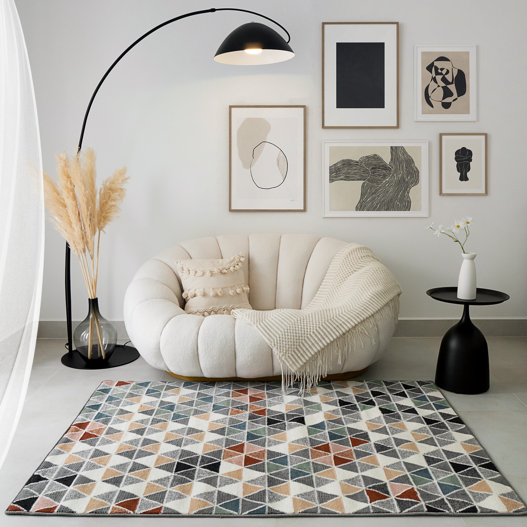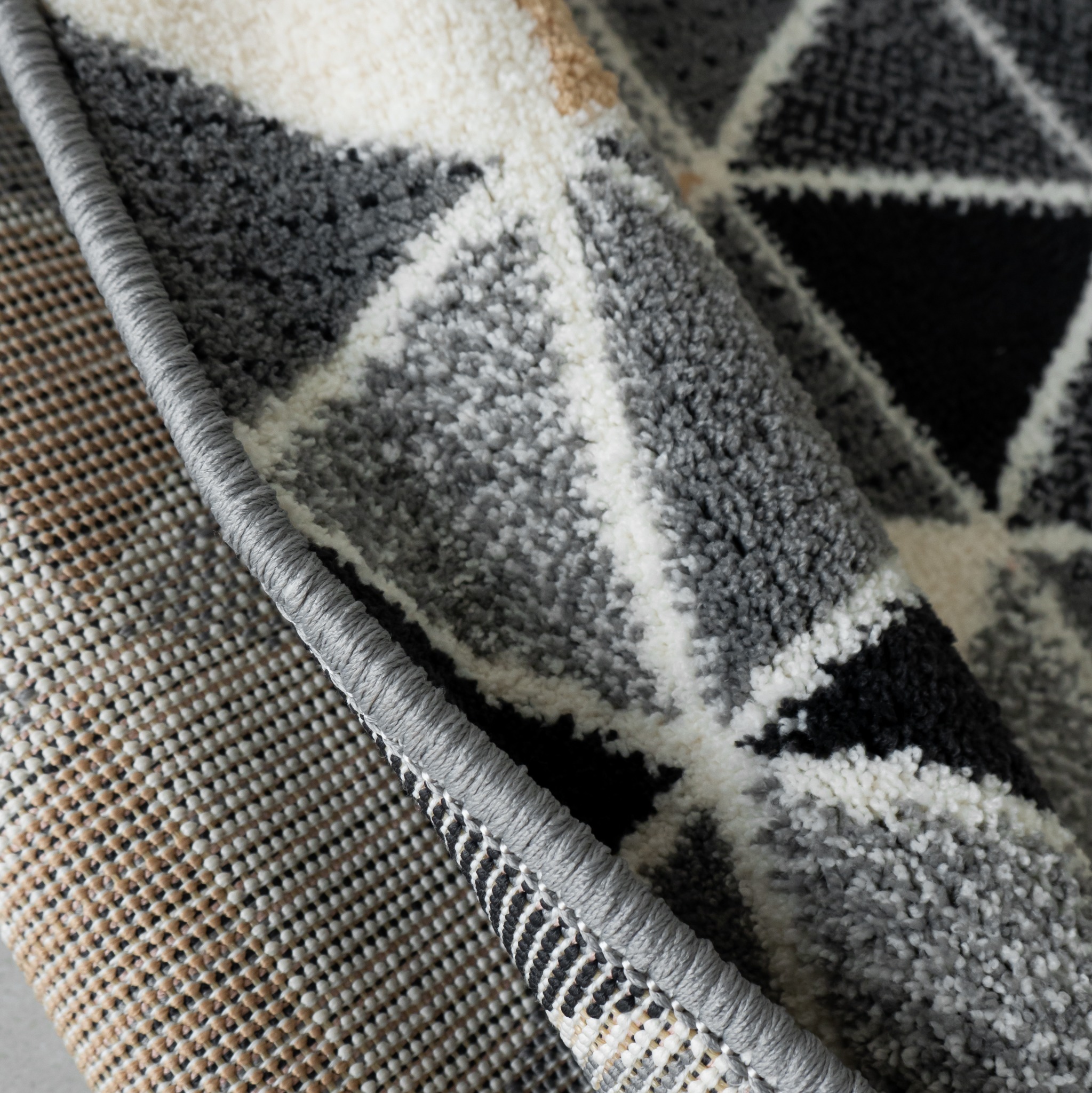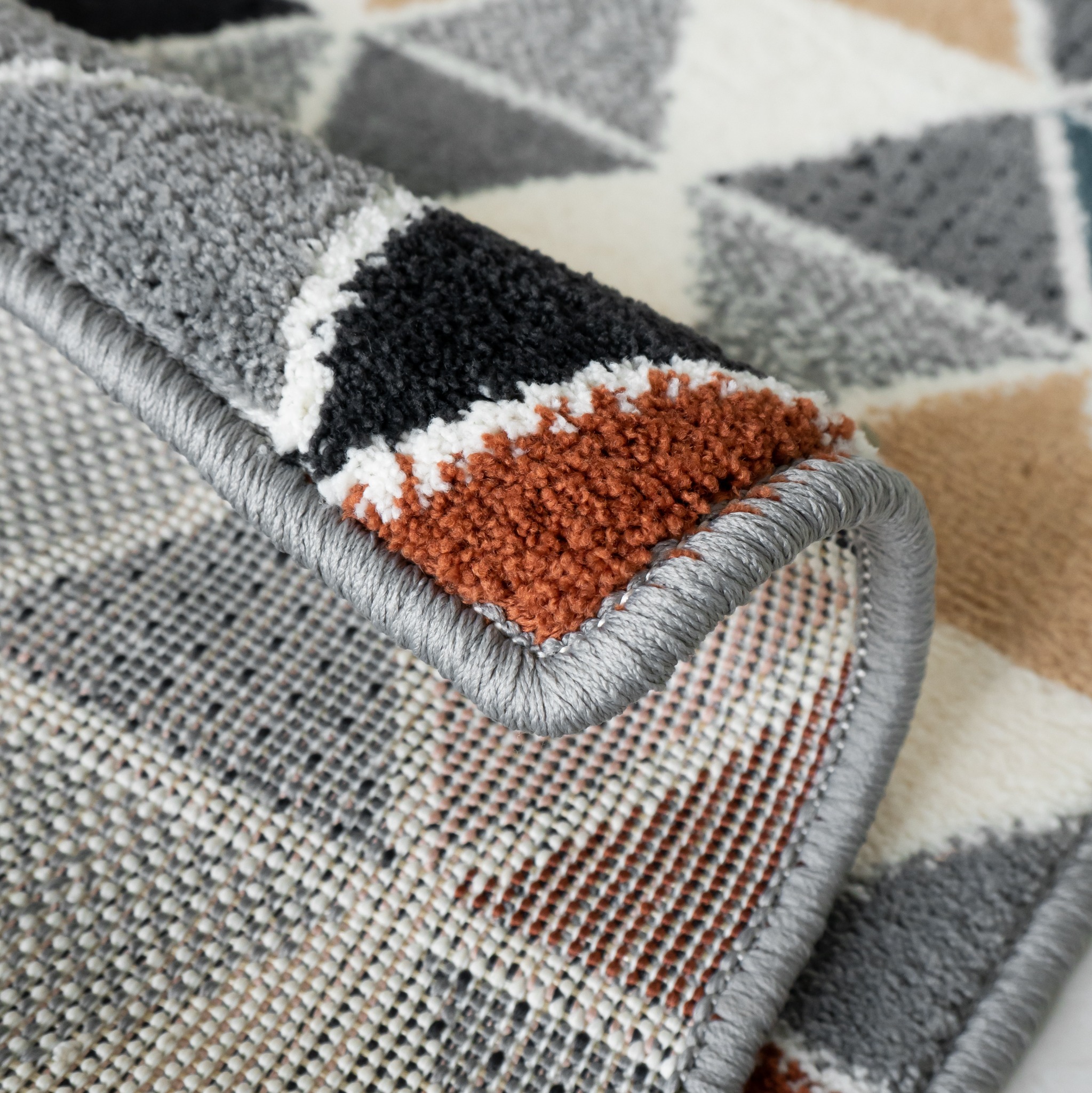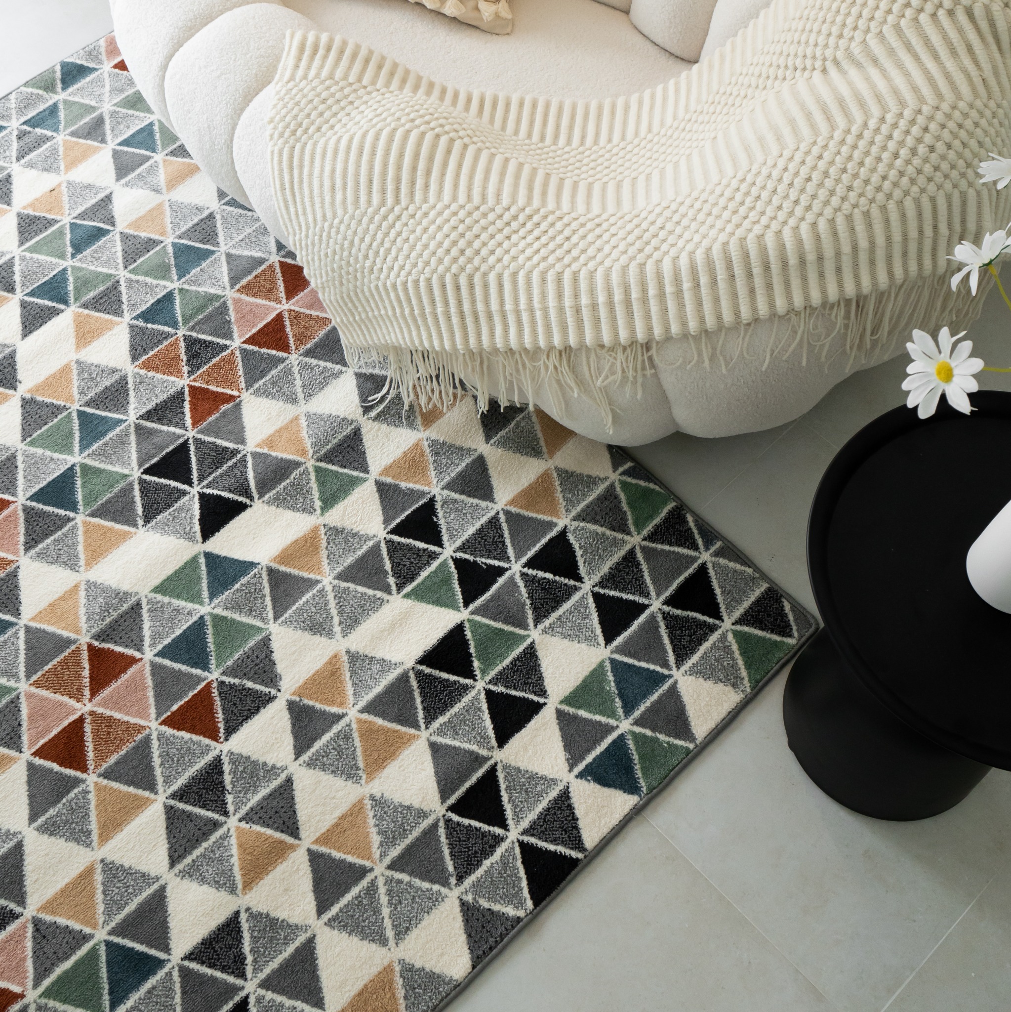 Ấn tượng ban đầu khi nhìn thấy Thảm Lông Sợi Ngắn Alice Họa Tiết Đa Giác Vạn Hoa chính là vẻ đẹp gây "lú". Diện mạo của Thảm Alice được tạo nên từ hàng trăm khối tam giác nhỏ, gộp lại thành các hình đa giác với đầy đủ sắc màu. Với thiết kế độc đáo trên, Item sở hữu vẻ ngoài "đa diện" như một viên đá quý, tinh tế ở mọi góc nhìn.