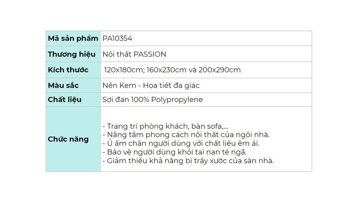 Thảm Lông Sợi Ngắn Alice Họa Tiết Đa Giác Vạn Hoa sở hữu chất lượng đạt chuẩn với công nghệ sản xuất hiện đại. Thảm sử dụng chất liệu sợi đan 100% Polypropylene, có độ mềm mại vô cùng ấn tượng. Lông Thảm được gia công kỹ lưỡng, hạn chế tình trạng rụng, vì thế gia đình cho trẻ nhỏ hoàn toàn an tâm khi sử dụng sản phẩm mới của Nhà Passion!