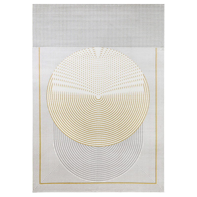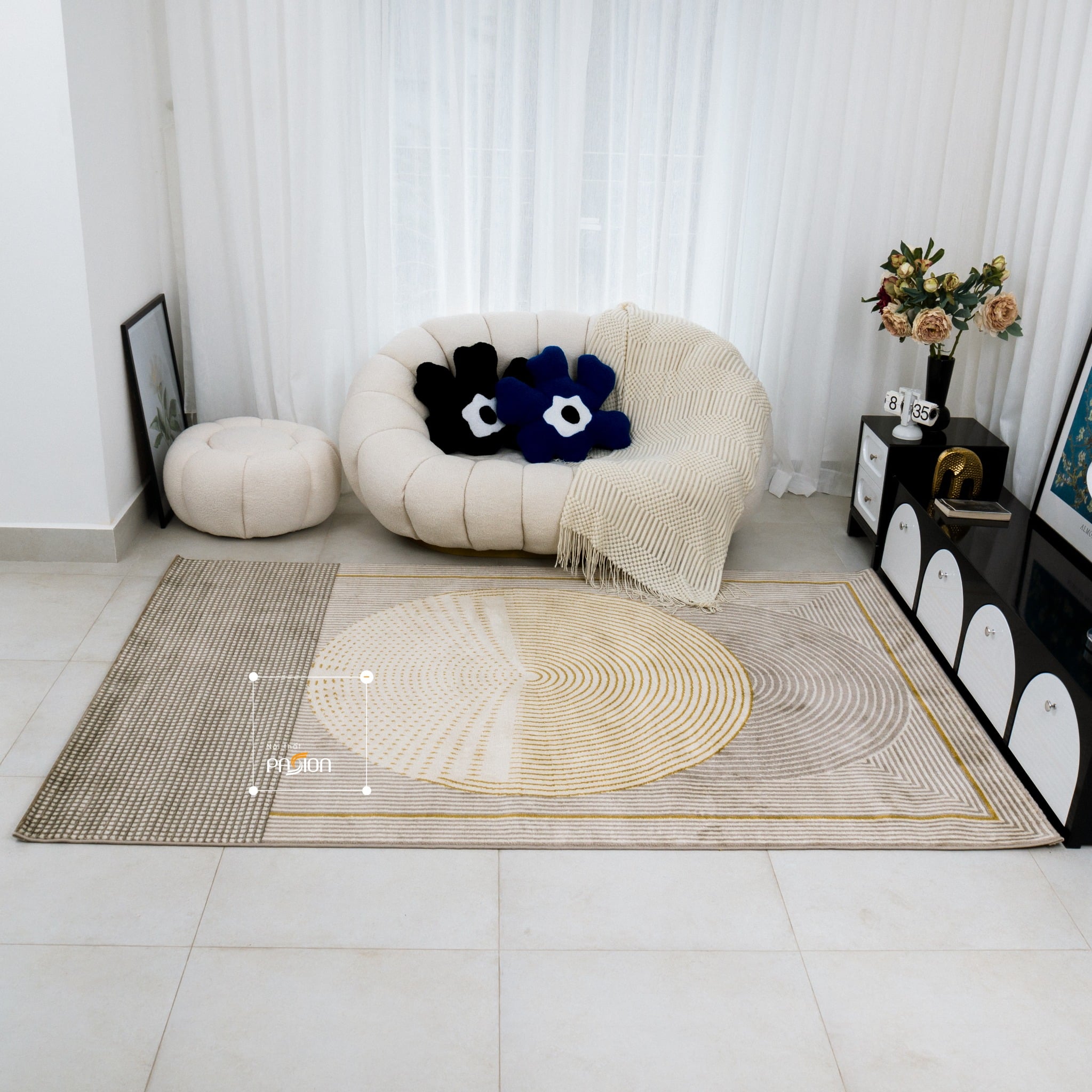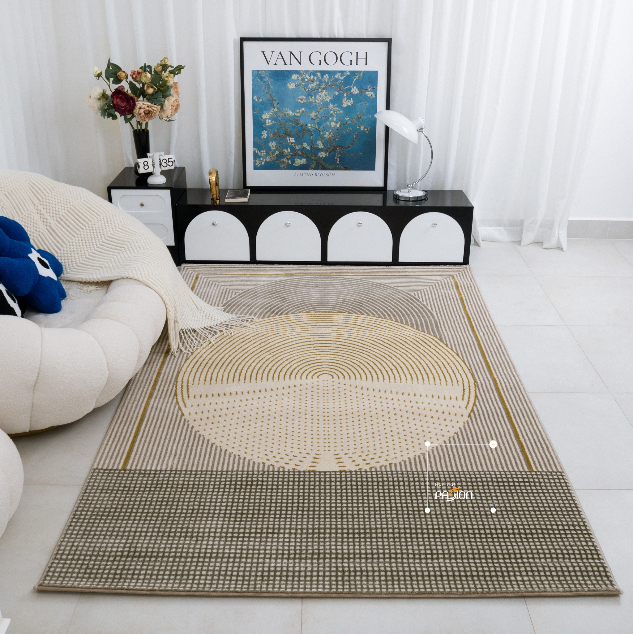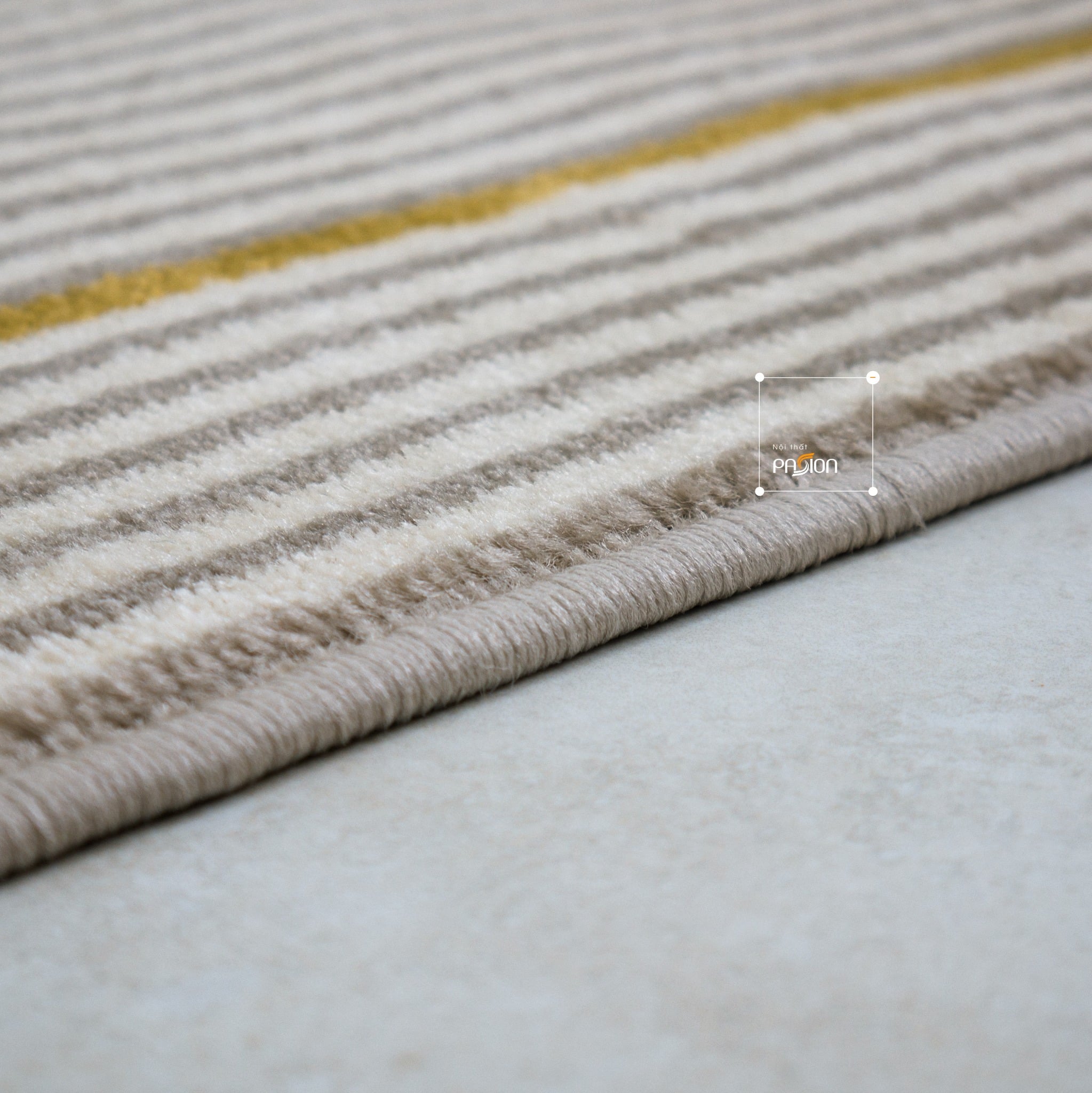 - Thiết kế hiện đại: Thảm có thiết kế hiện đại với gam màu xám thanh lịch kết hợp điểm nhấn vàng ánh bạc lấp lánh, tạo nên sự sang trọng và tinh tế cho căn phòng.