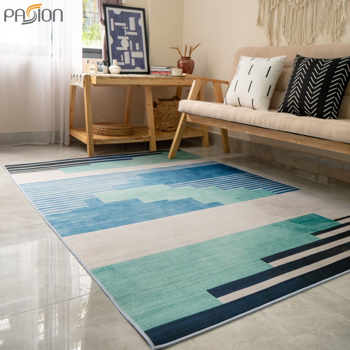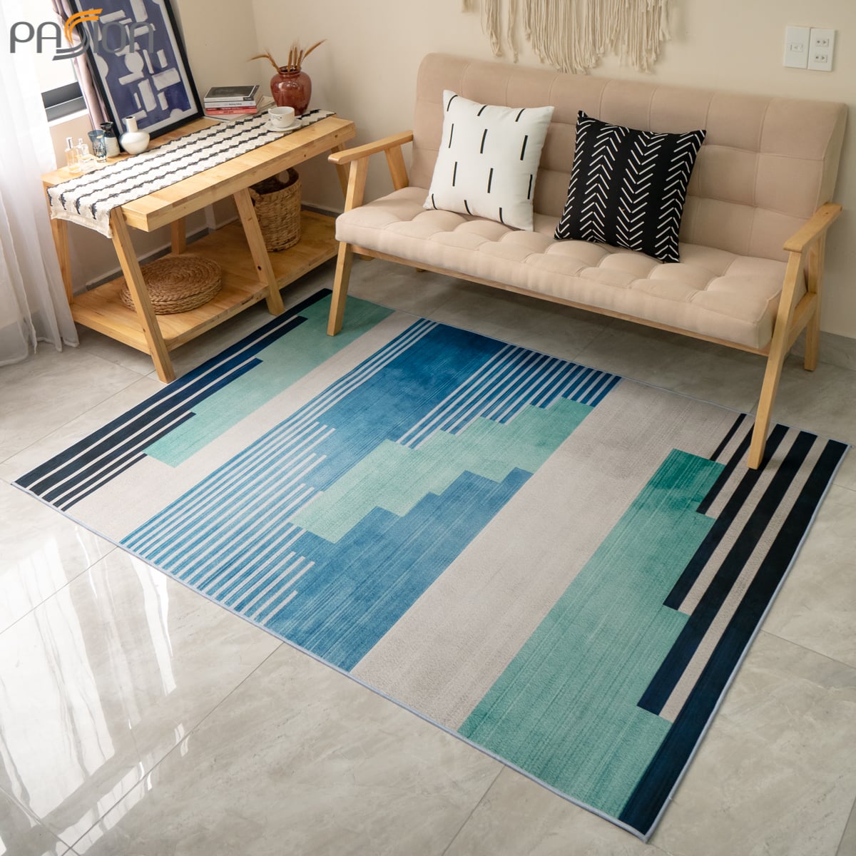 Thảm Nhung Nỉ Trải Sàn Hình Học Tông Xanh Xám Phối Màu Hiện Đại