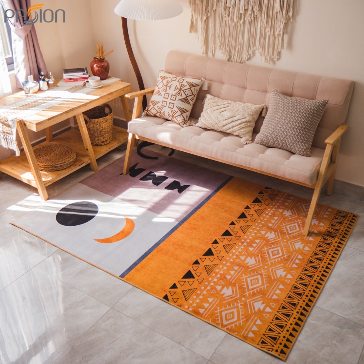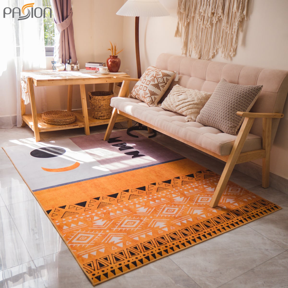 Với họa tiết nổi bật nhưng không kém phần tinh tế, màu sắc của tấm thảm chủ yếu là tông màu đen, vàng, trắng. Mẫu thảm nỉ trải sàn Nhật Nguyệt nổi bật lên thế mạnh của mình đó là phù hợp với không gian phòng khách hiện đại.