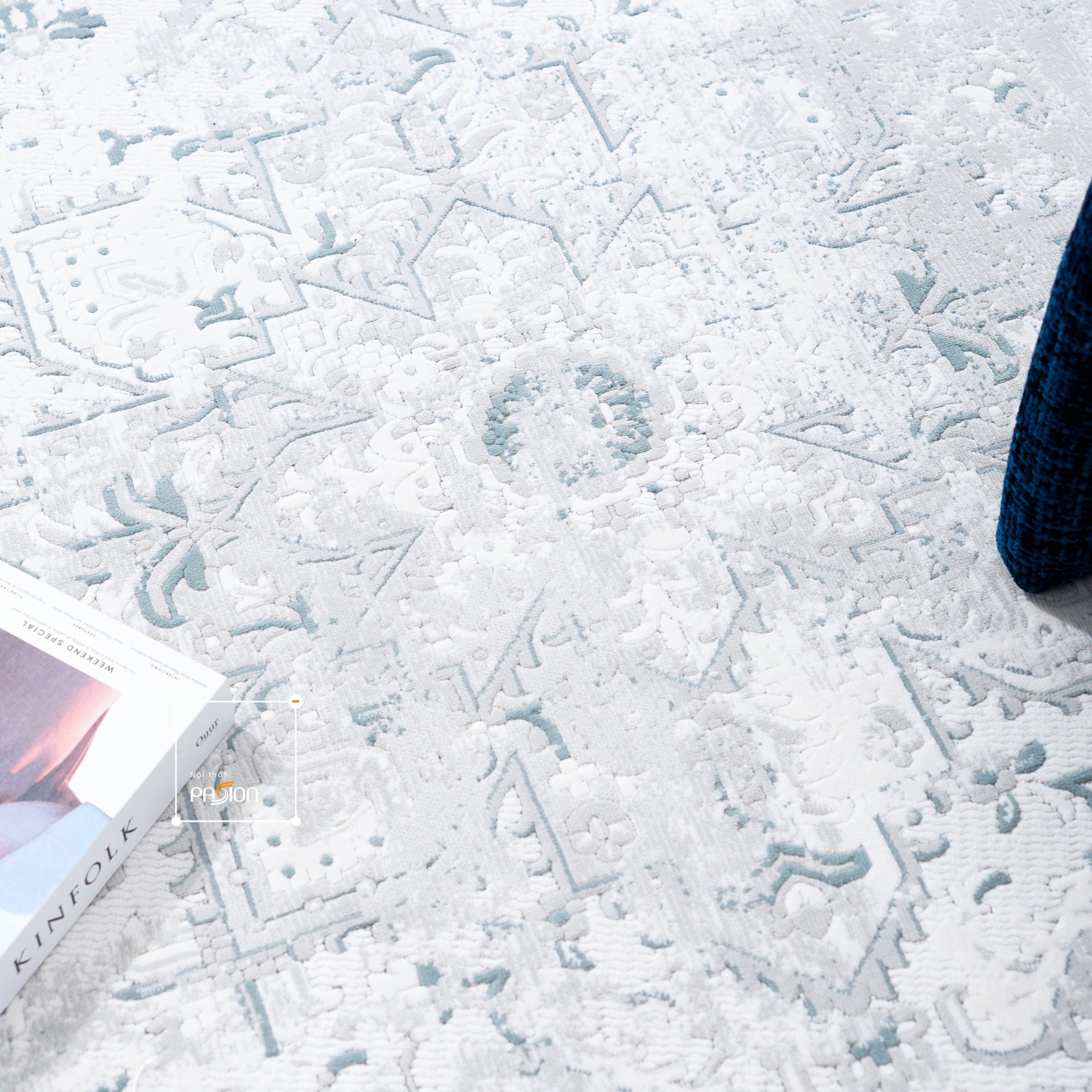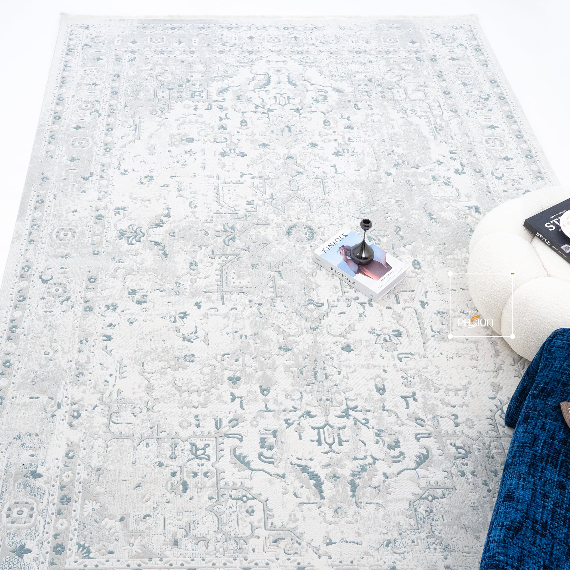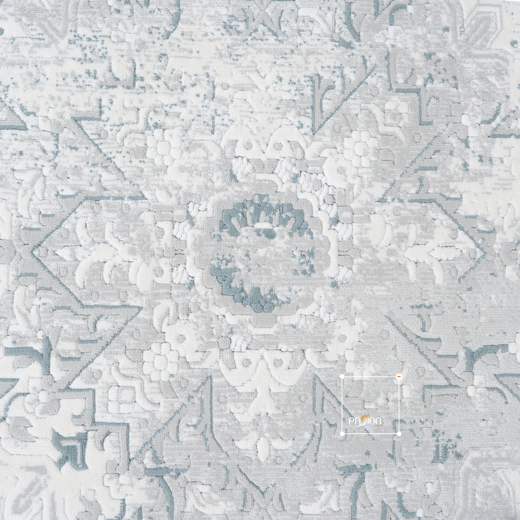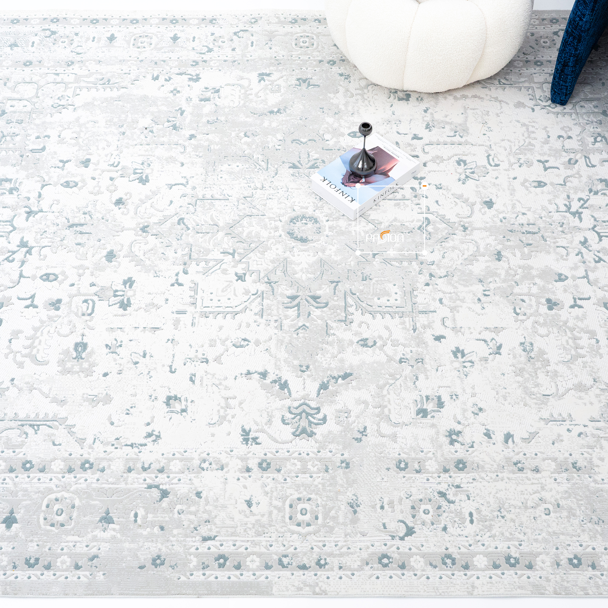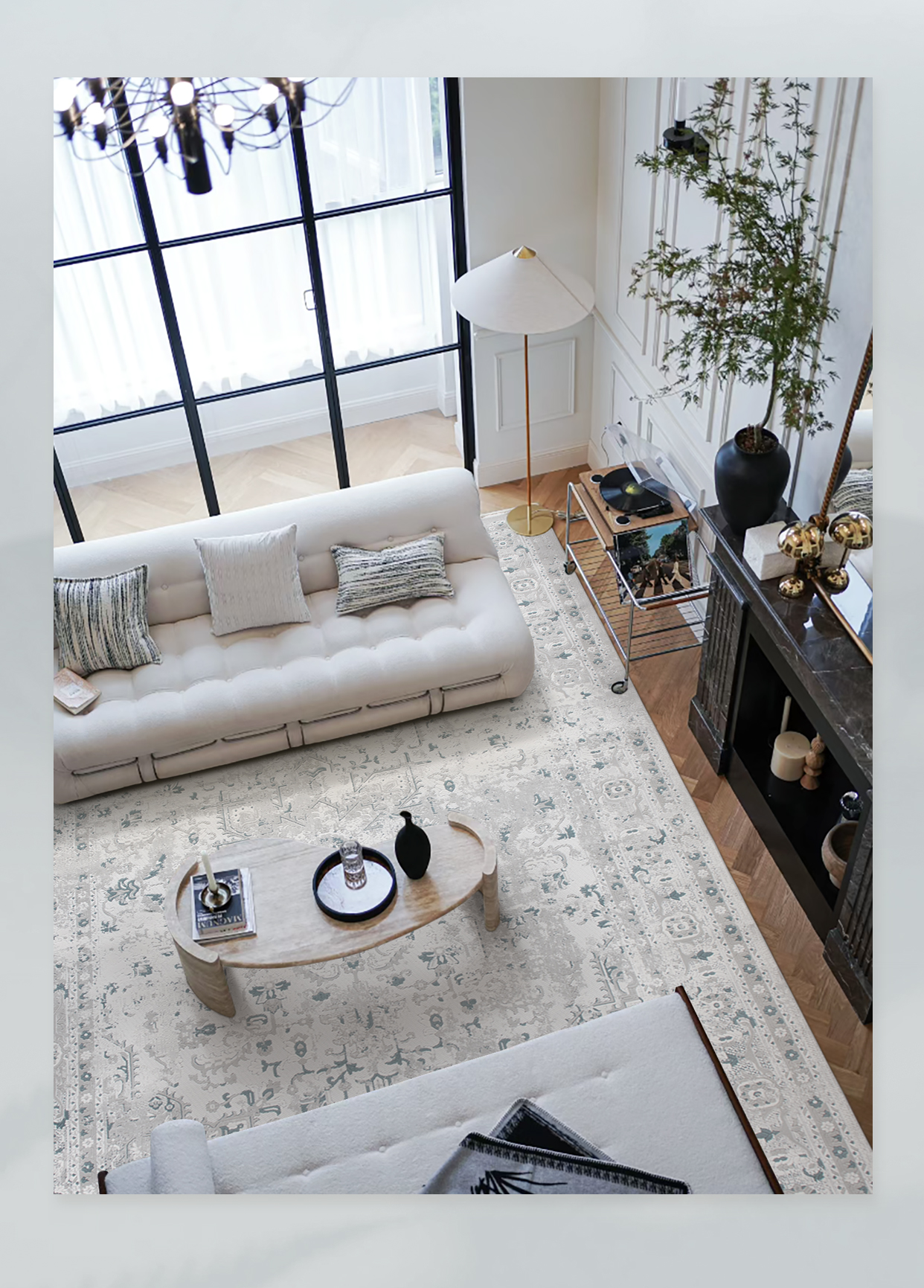 Màu sắc chủ đạo là xanh navy pha xám, tạo nên hiệu ứng thị giác độc đáo: vừa thanh lịch, sang trọng, lại dễ kết hợp với các tông màu nội thất hiện đại như trắng, kem, gỗ tự nhiên hay xám tro. Hoa văn tinh xảo mang đậm chất phương Đông cổ điển, giúp nâng tầm thẩm mỹ cho mọi không gian đặt thảm.
