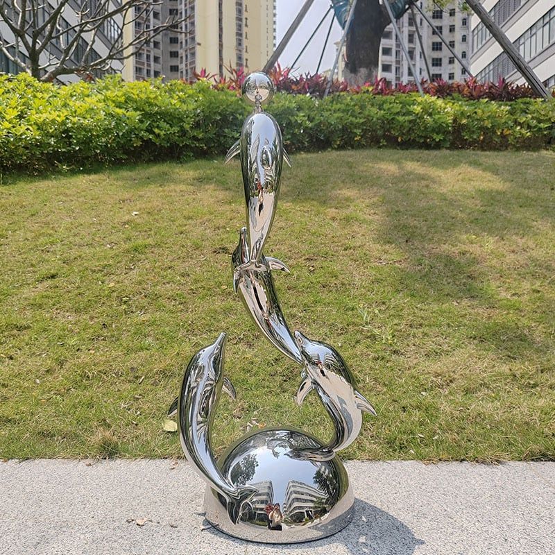 Điểm nhấn ấn tượng: Tượng cá heo uốn lượn mềm mại, phản chiếu ánh sáng đa chiều, tạo hiệu ứng sinh động cho sảnh hoặc khu vườn.