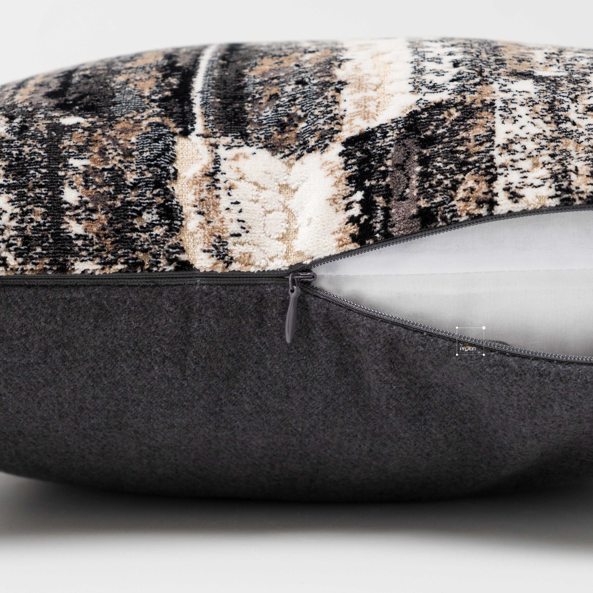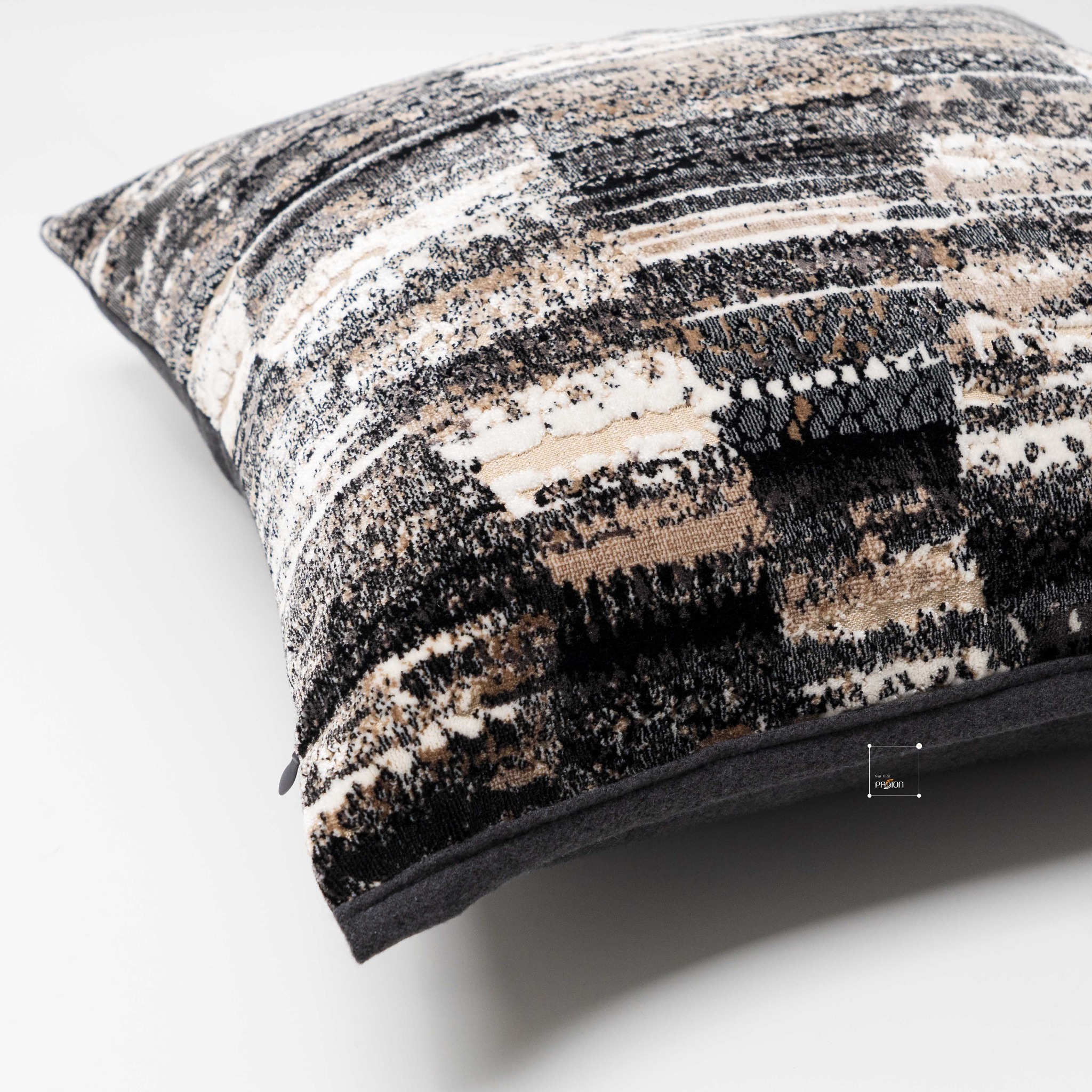 Gối tựa lưng họa tiết nhung xám cafe phù hợp với nhiều phong cách nội thất như hiện đại, tối giản, hoặc cổ điển.