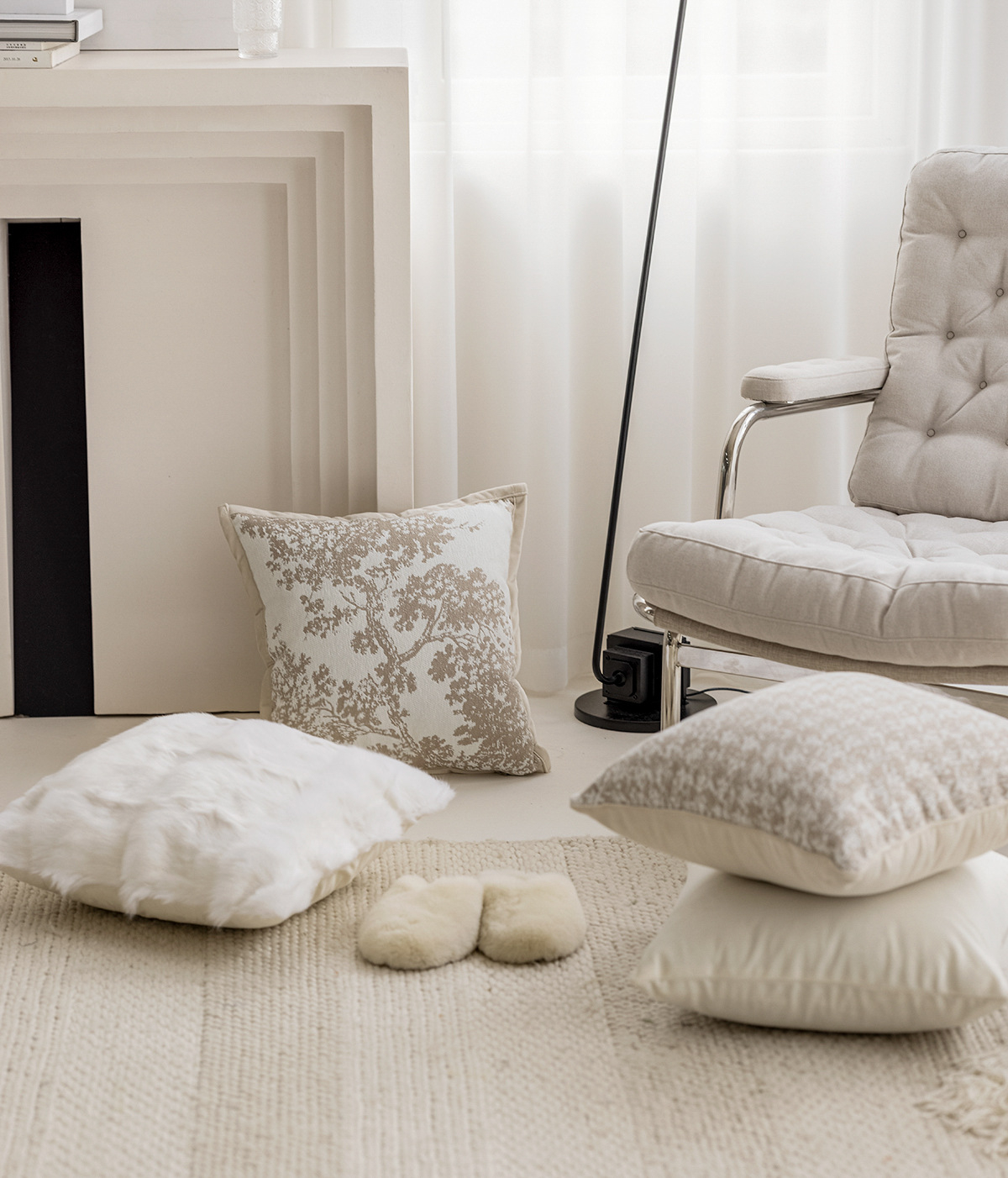 Gối tựa lưng tông kem trừu tượng phù hợp với nhiều phong cách nội thất như hiện đại, tối giản, Wabi Sabi, hoặc cổ điển.