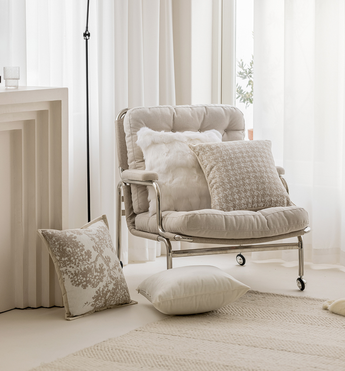 - Tôn lên không gian: Là màu sắc trung tính, gối tựa lưng tông kem dễ dàng làm nổi bật các chi tiết trang trí khác trong căn phòng.