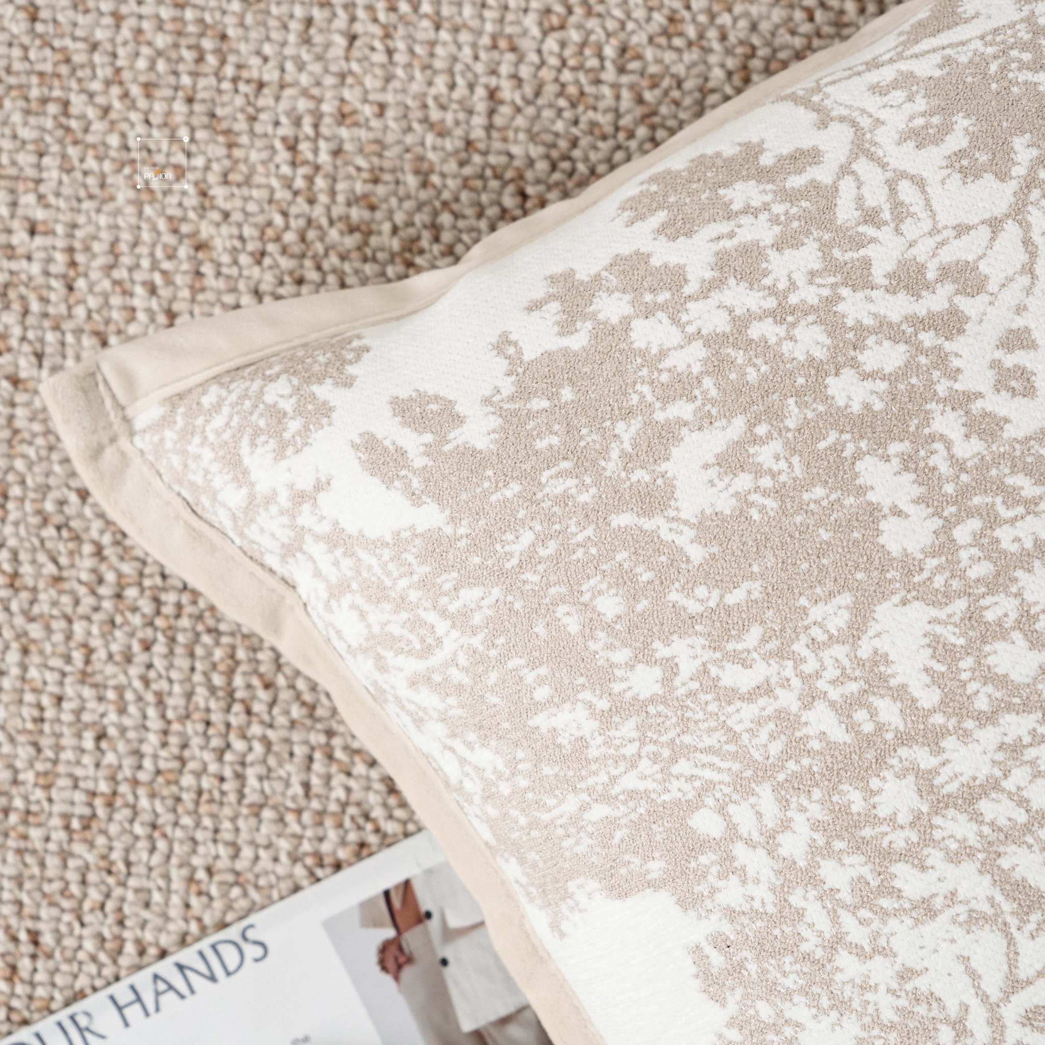 Phong cách Wabi Sabi là triết lý đề cao sự tự nhiên, giản dị, và tôn trọng sự không hoàn hảo. Gối tựa lưng sofa tông kem trừu tượng thể hiện rõ nét tinh thần này: