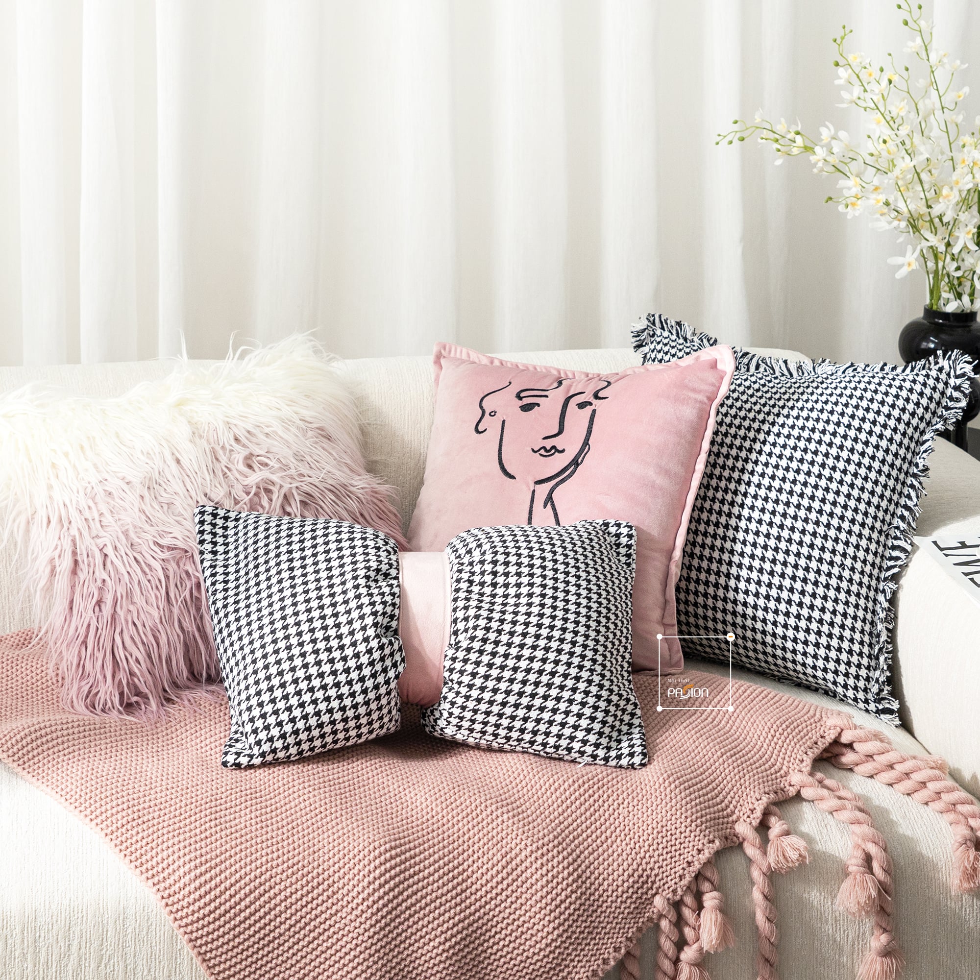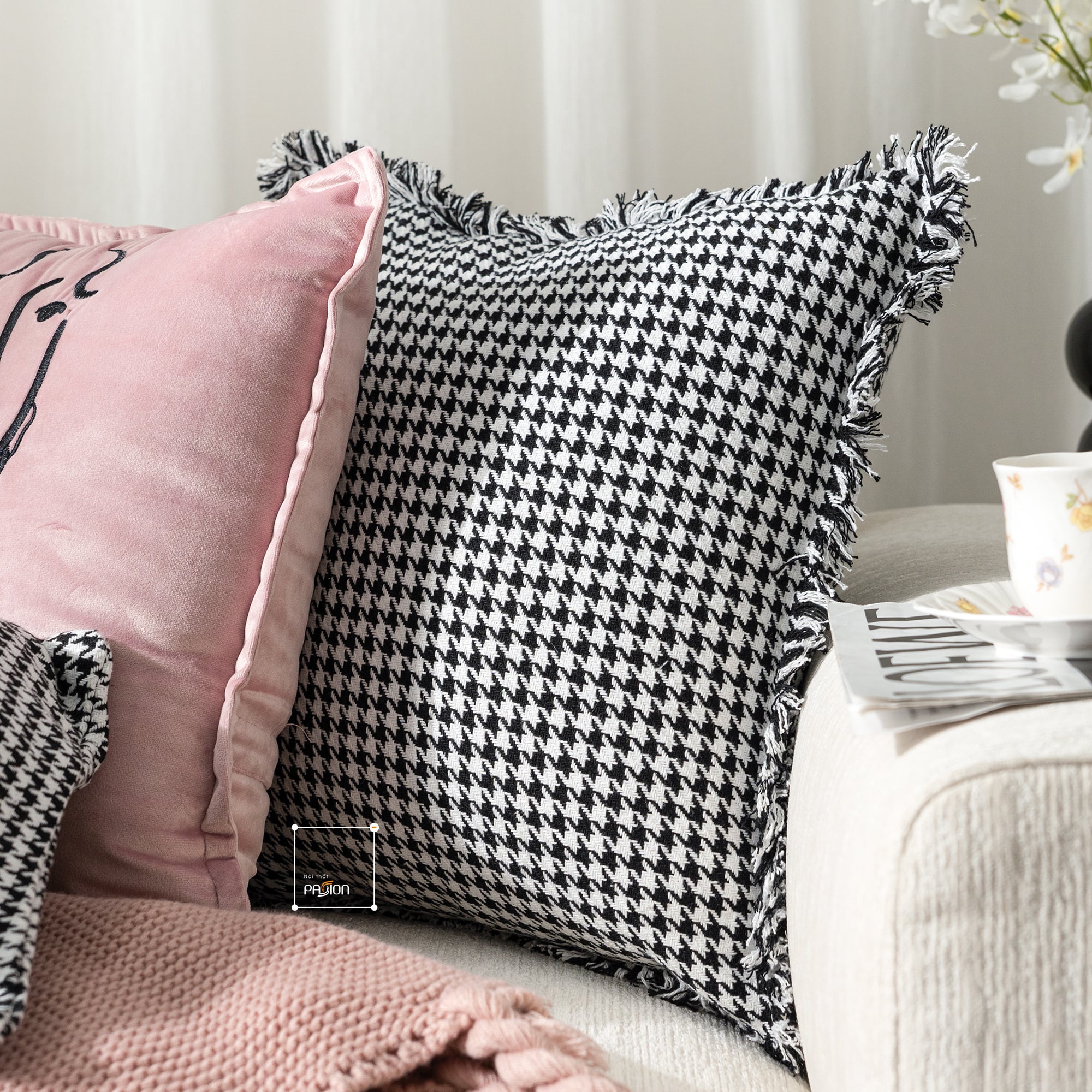 Gối Tựa Lưng Trang Trí Sofa Họa Tiết Houndstooth kết hợp Gradient rối là bộ sưu tập gối tựa sofa sang trọng theo phong cách họa tiết Hoodstood cổ điển dựa vào sắc hồng và đen phối màu, thích hợp trang trí ghế sofa, ghế văn phòng, tủ kệ và làm quà tặng giá trị cho người bạn yêu mến.